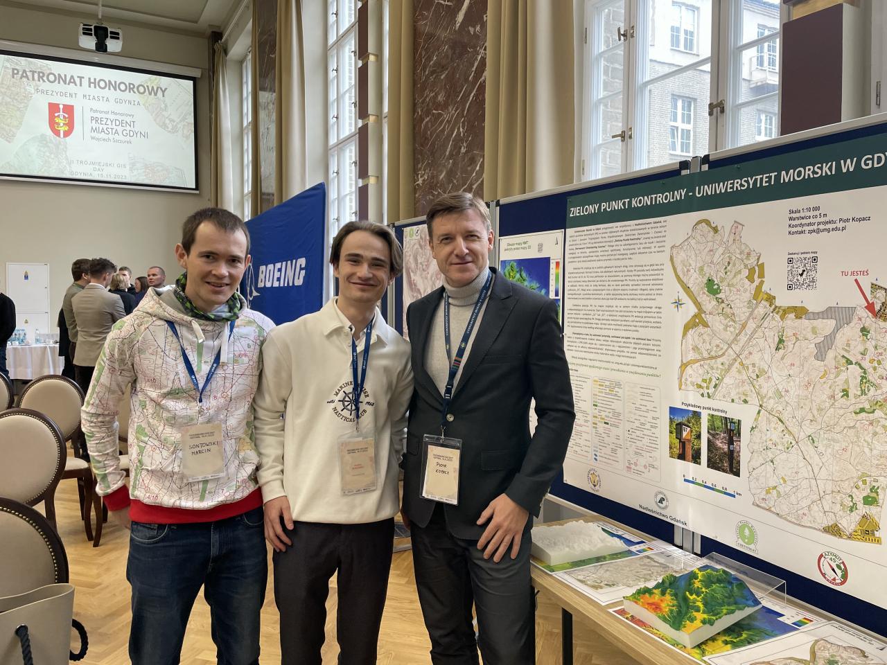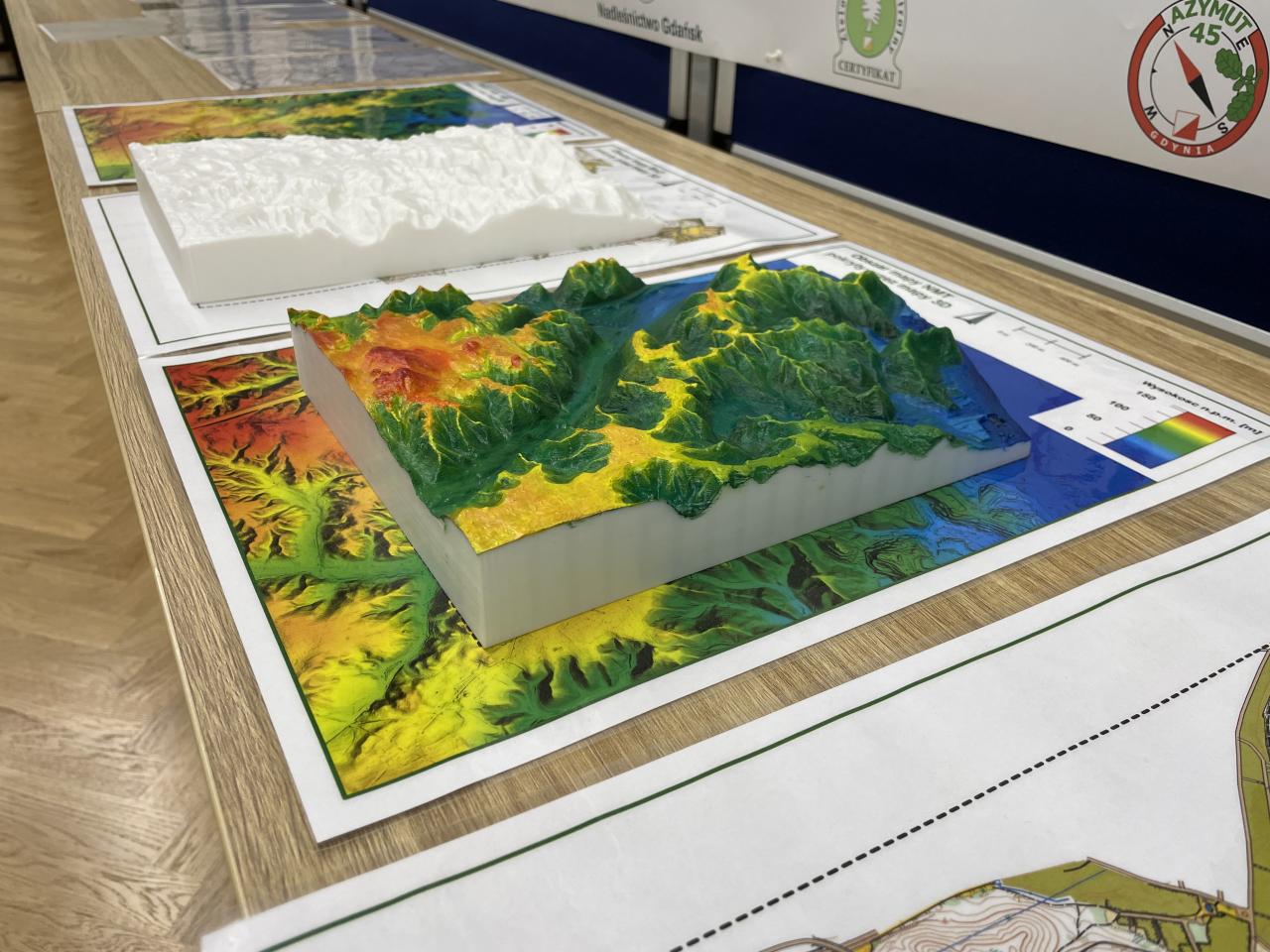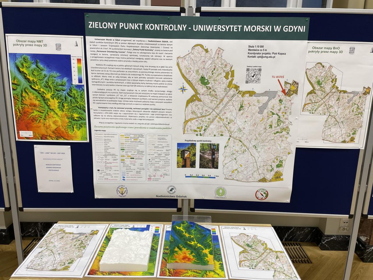 TriCity GIS Day 2023 was held at Gdynia Maritime University on 15 November. The event was organised by the LoGIStic Student Scientific Circle of the Department of Transport at the Faculty of Navigation. "GIS Day" is an international educational event aimed at popularising knowledge and the practical application of geographical information systems (GIS). In addition to attending lectures, guests were also presented with posters on the GMU Permanent Orienteering Courses, including maps of the area in a variety of visualizations and 3D models. A presentation on the project was put together by Piotr Kopacz and Marcin Sontowski, and a 3D printout of the map of the "Chylonia" area was hand-painted by Asia Rogowska.