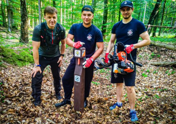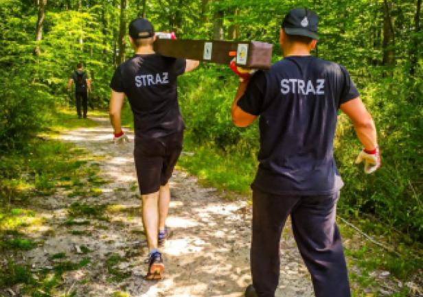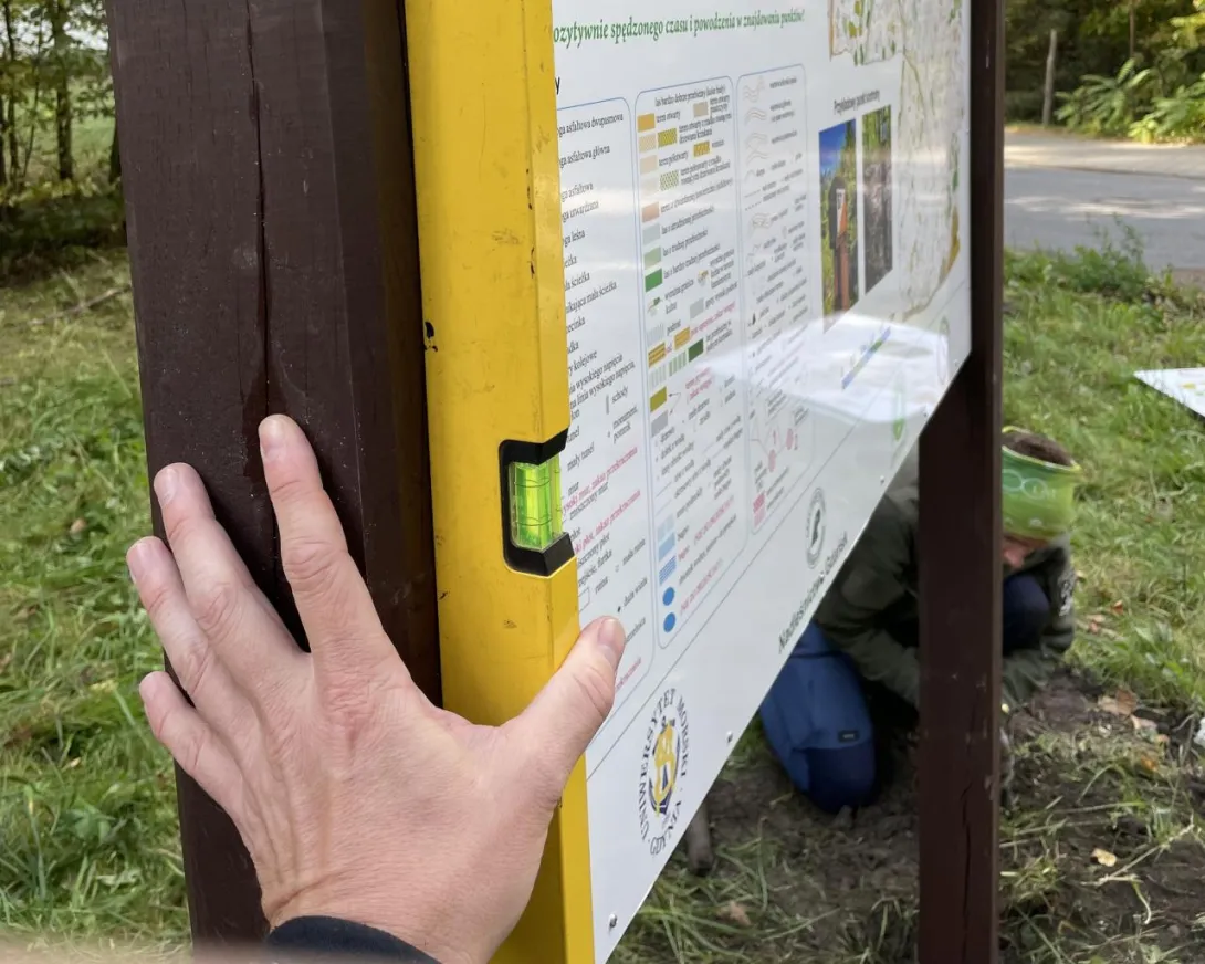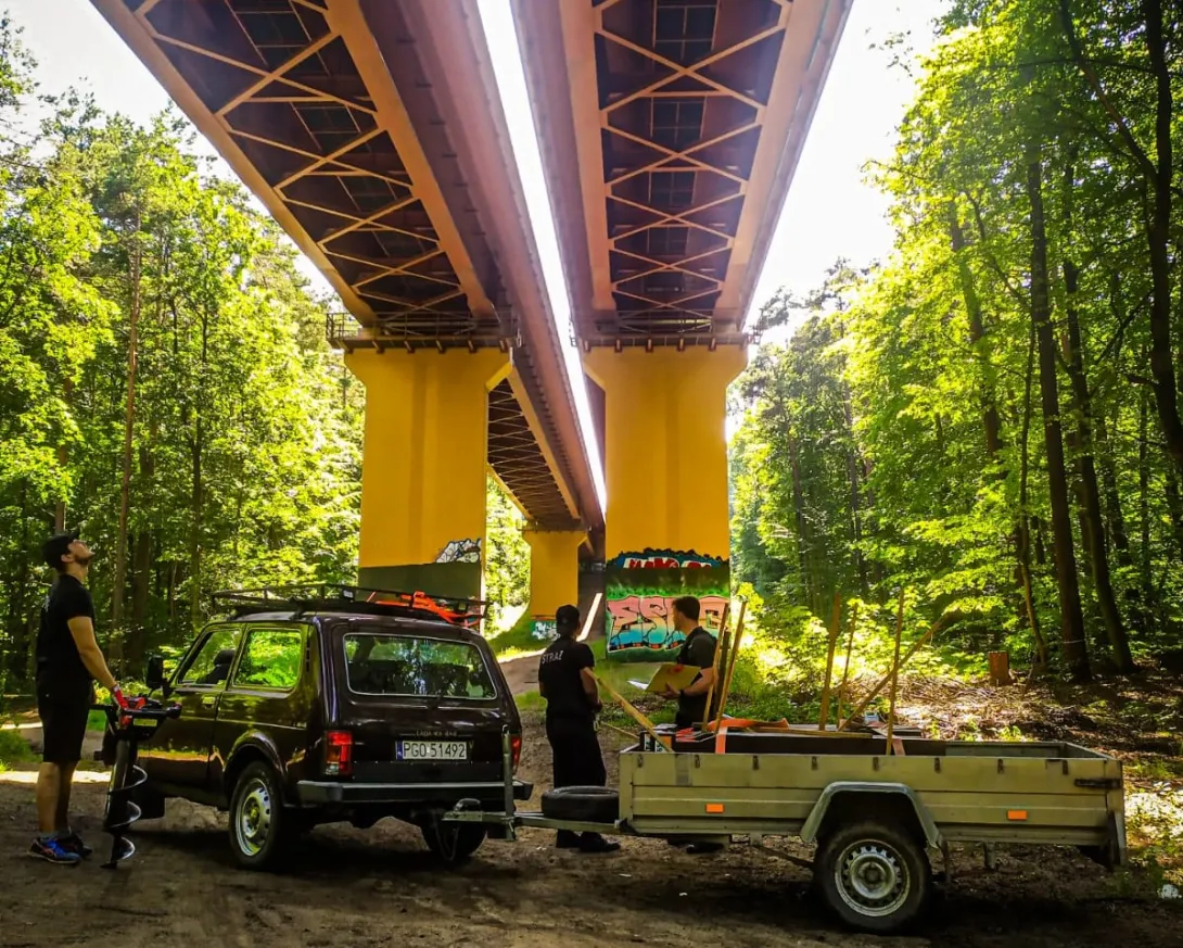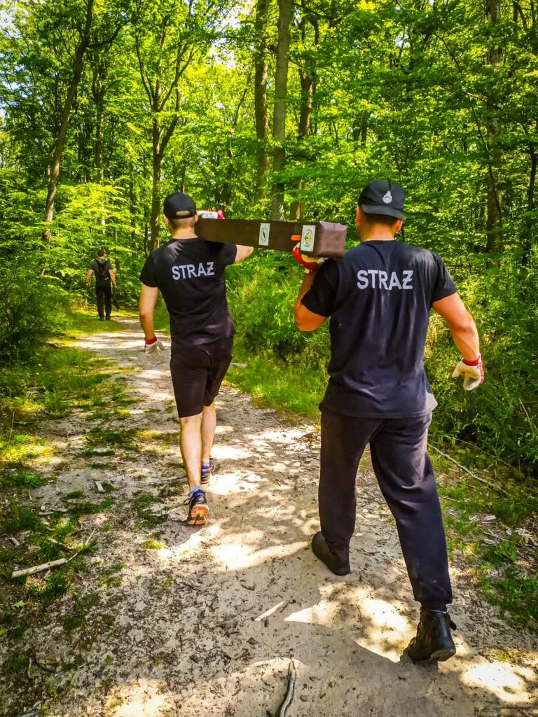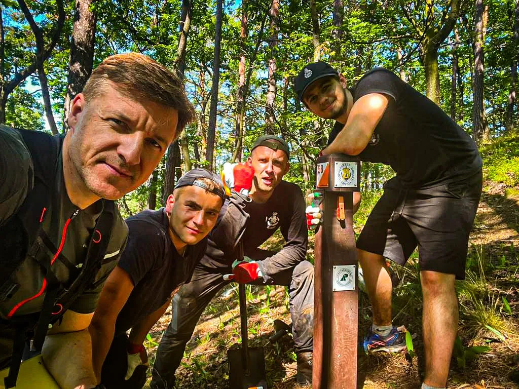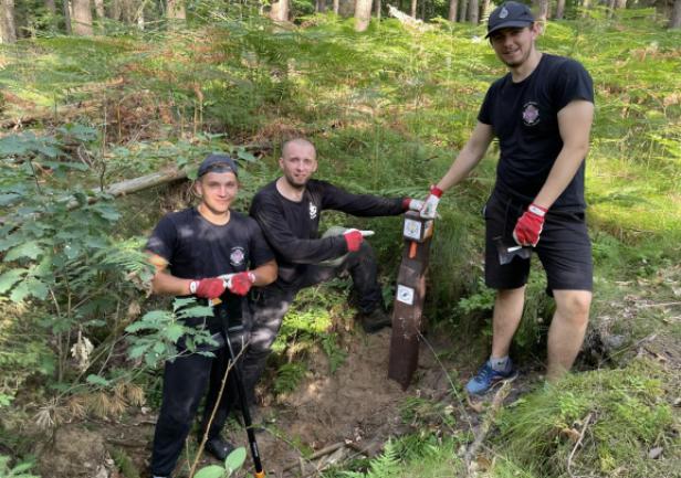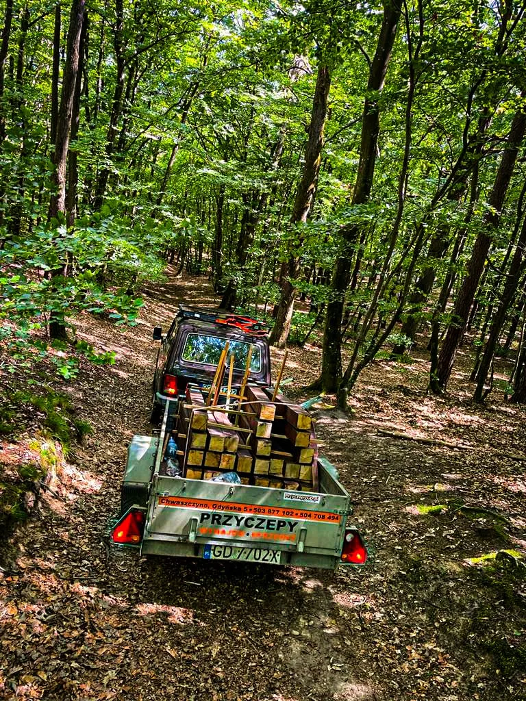(...) Wszystkie 42 punkty kontrolne (PK) w formie dębowych słupków udało się nam "zasadzić" w terenie w jeden dzień. Była to upalna sobota 15.VII.2023r. Pierwszym zainstalowanym punktem kontrolnym był PK 45 w południowej i najbardziej płaskiej części obszaru ZPK-UMG. Mimo iż nie obyło się bez małych przygód na błotnistych leśnych drogach (m.in. konieczne były rozprzęgania przyczepy i wyciągania samochodu, który ugrzązł w paru miejscach) i intensywnej pracy, świetna atmosfera towarzyszyła nam przez cały dzień. "Grupa robocza" składała się z czterech osób: druhów Antka Dopke, Szymona Helanda, na czele z Kamilem Dopke z Ochotniczej Straży Pożarnej w Bojanie, którym należą się szczególne podziękowania za pomoc w montażu infrastruktury, oraz Piotra Kopacza z Wydziału Nawigacyjnego UMG - pomysłodawcę i koordynatora całego projektu. Warto wspomnieć, iż Kamil jest absolwentem Wydziału Mechanicznego UMG sprzed kilku lat.