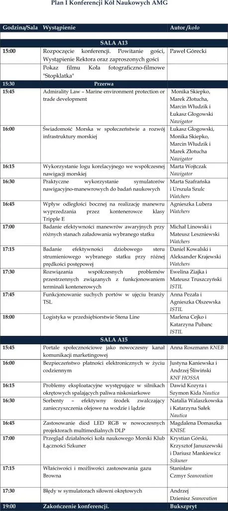Fundacja AMG w porozumieniu z Parlamentem Studentów Akademii Morskiej w Gdyni oraz kołami naukowymi: Seanovation i Innowacyjnych Systemów Elektronicznych zapraszają do uczestnictwa w I Konferencji Kół Naukowych AMG wszystkich studentów, a szczególnie tych zainteresowanych działalnością naukową oraz działalnością na rzecz środowiska akademickiego.