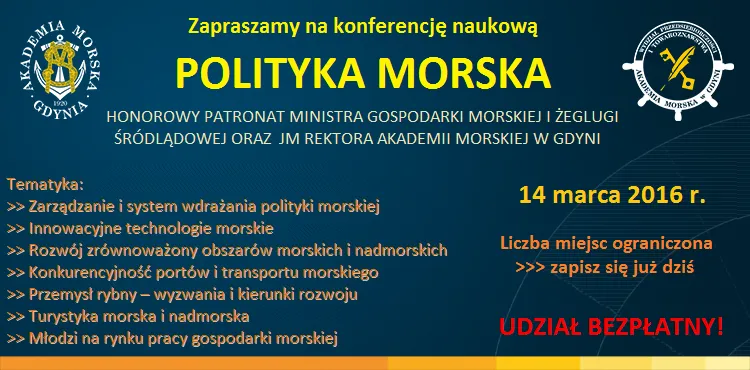 Akademia Morska w Gdyni, Wydział Przedsiębiorczości i Towaroznawstwa zaprasza na Ogólnopolską Konferencję Naukową POLITYKA MORSKA. Celem konferencji jest analiza stopnia realizacji polityki morskiej Polski i określenie metod, działań i narzędzi optymalnego wykorzystania morskiego potencjału Polski. Konferencja bezpłatna - liczba miejsc ograniczona.