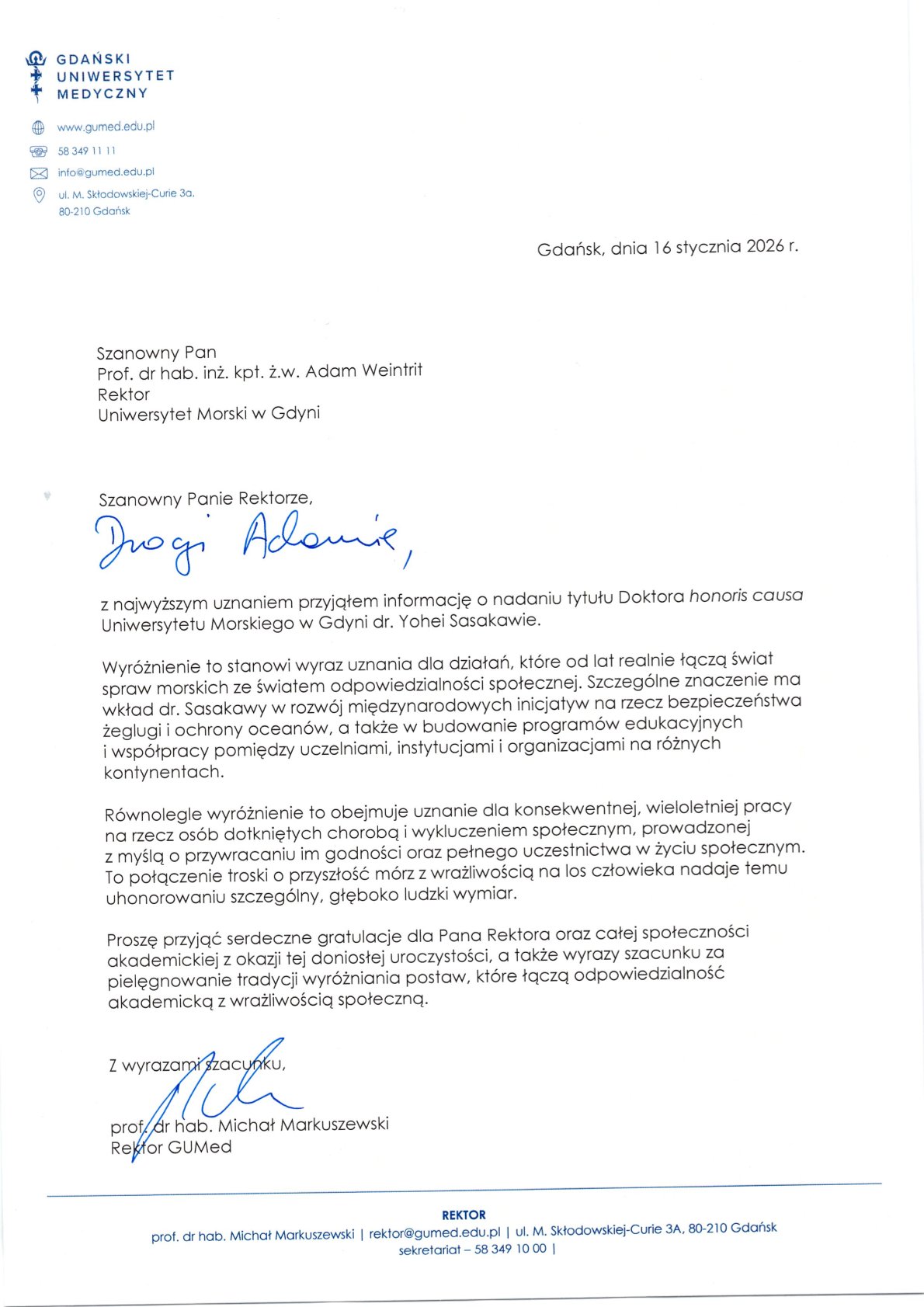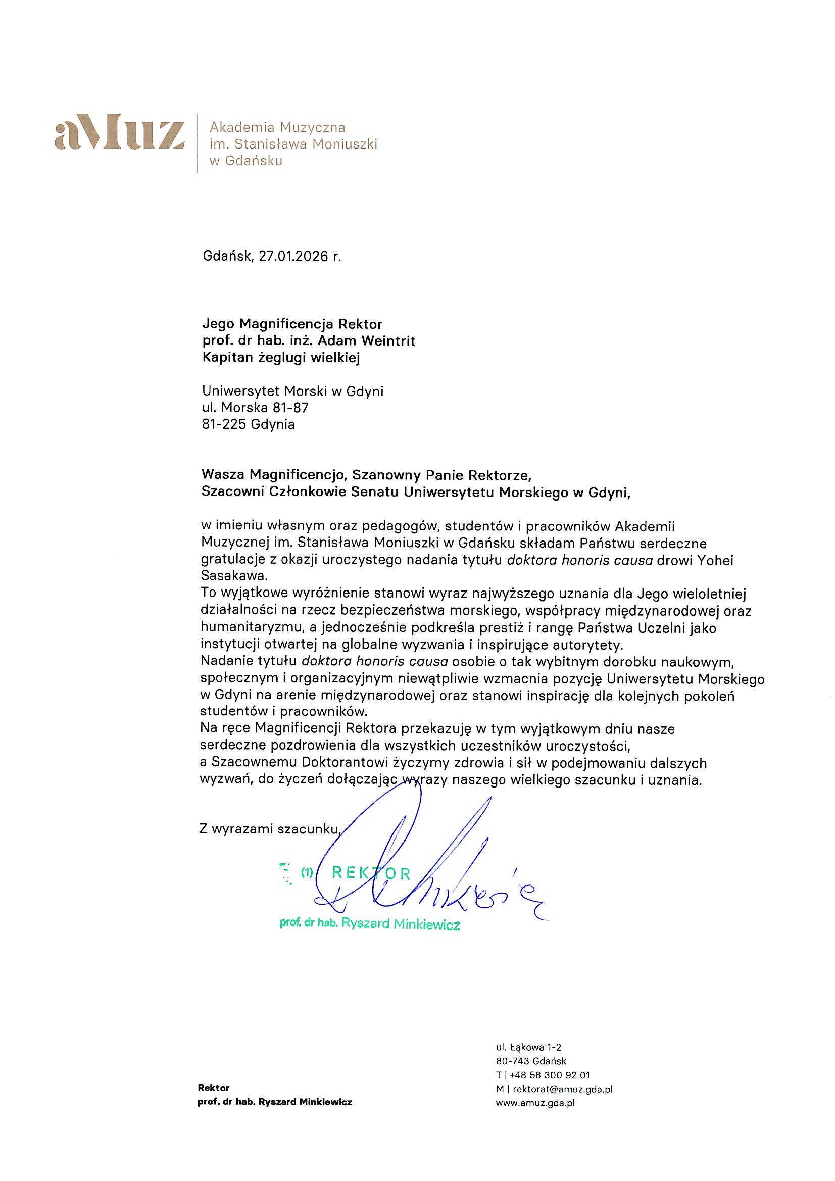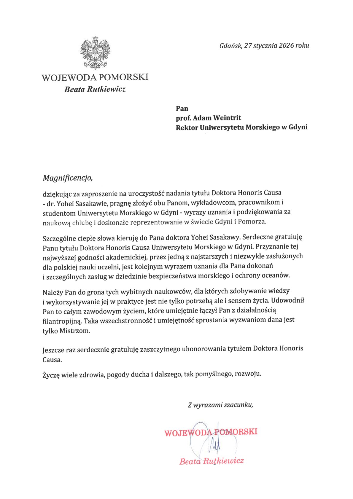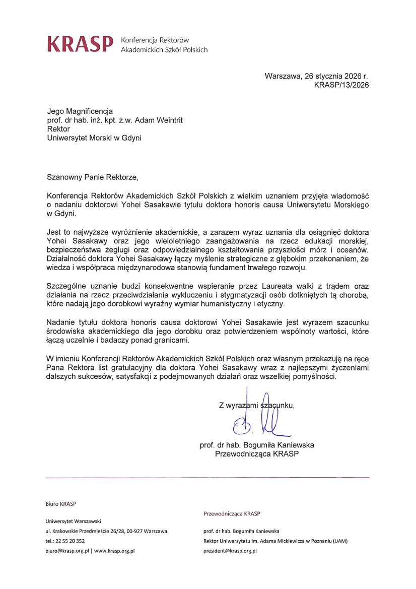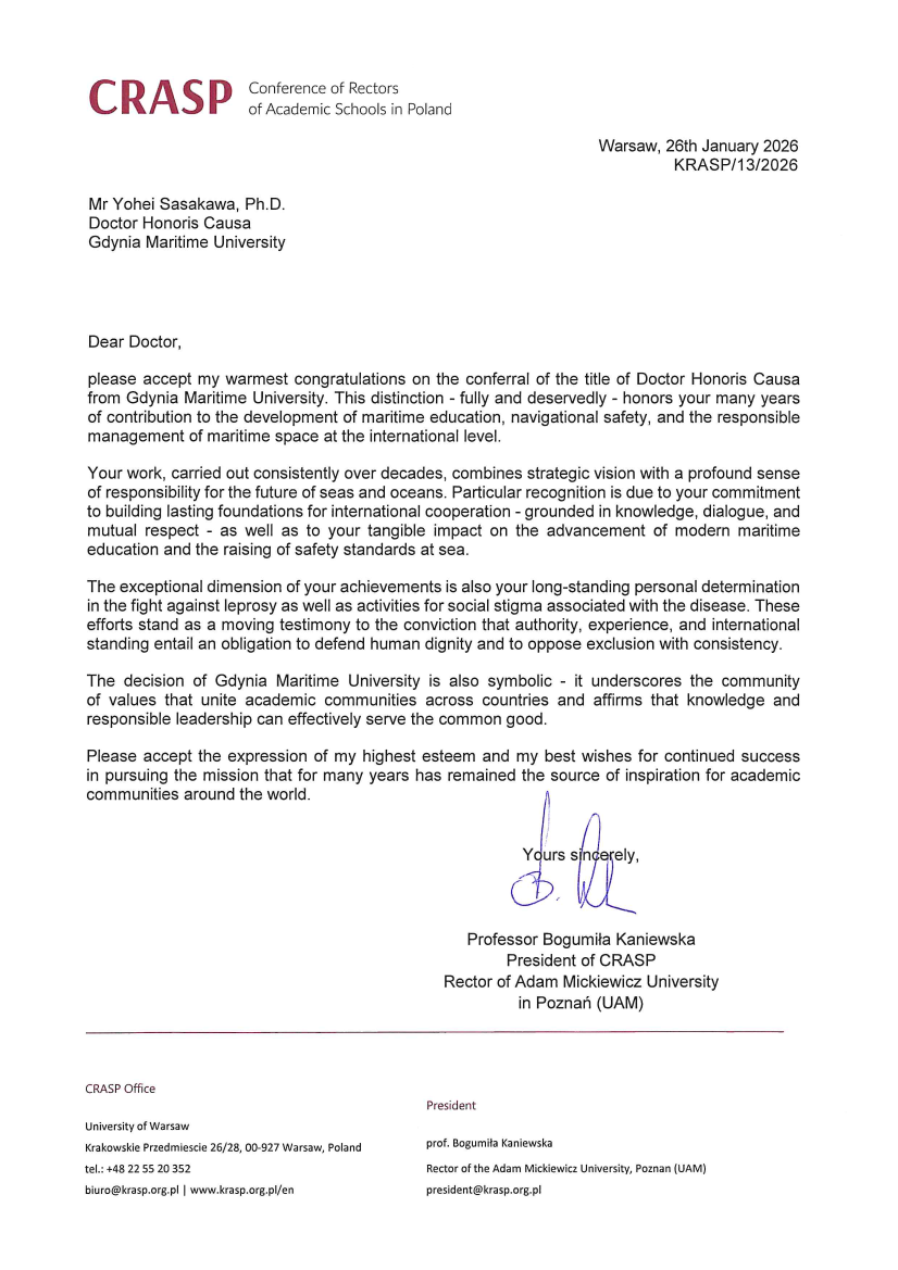 Z okazji nadania Dr. Yohei Sasakawie honorowego tytułu Doktora Honoris Causa Uniwersytetu Morskiego w Gdyni, Uczelnia oraz Dr Sasakawa otrzymali listy gratulacyjne.