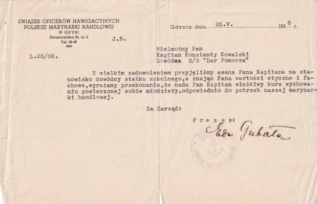 kpt. ż.w. Konstanty Kowalski (1902-1969) – absolwent Wydziału Nawigacyjnego z 1927 r., komendant żaglowca „Dar Pomorza", organizator polskiego szkolnictwa morskiego w Wielkiej Brytanii, inspektor załóg polskiej floty handlowej w Anglii.