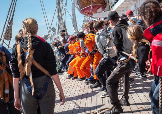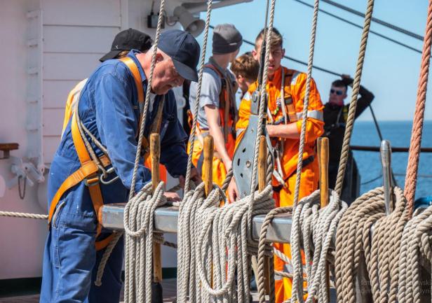 Po słonecznym pożegnaniu z Gdynią, podobną pogodą powitał nas Bałtyk. Słonecznie i bezwietrznie. Rzadko można o tym czasie spotkać tak spokojne morze. Zatem proces oswajania się z morzem przebiegał bez dramatów. Młodzież z zapałem rozpoczęła szkolenie. Ćwiczono wchodzenie na maszty, brasowanie, klarowanie żagli. Praktykanci - zarówno uczniowie techników morskich ze Szczecina i Świnoujścia, jak i laureaci konkursu - uczyli się rozkładu i nazw lin. Odbyto ćwiczebny alarm opuszczenia jednostki, alarm przeciwpożarowy i alarm człowiek za burtą, podczas którego chętni pływali wokół statku szalupą. Równocześnie młodzież pełniła wachty, podczas których wykonywała rutynowe prace konserwacyjne i pełniła służbę na mostku. Tęskniliśmy jedynie za wiatrem, który pojawił się w chwili gdy byliśmy ... na podejściu do Tallina!