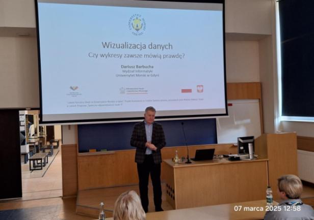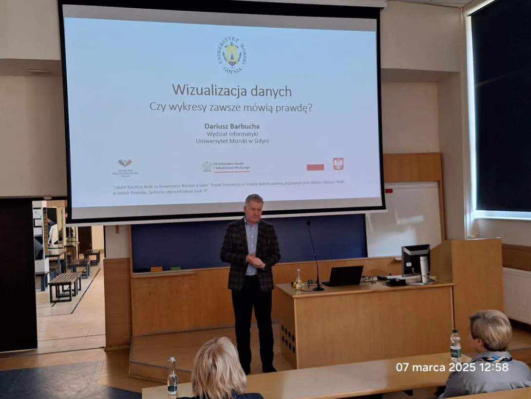 Zaplanowanych 12 wykładów dopełniła 13. prelekcja przeprowadzona przez Kierownika projektu – Prorektora ds. nauki Pana dr. hab. Dariusza Barbuchę, prof. UMG, który zobrazował, jak sposób wizualizacji danych wpływa na odbiorców począwszy od doboru prezentowanych informacji, zastosowanej skali, a nawet użytych kolorów.