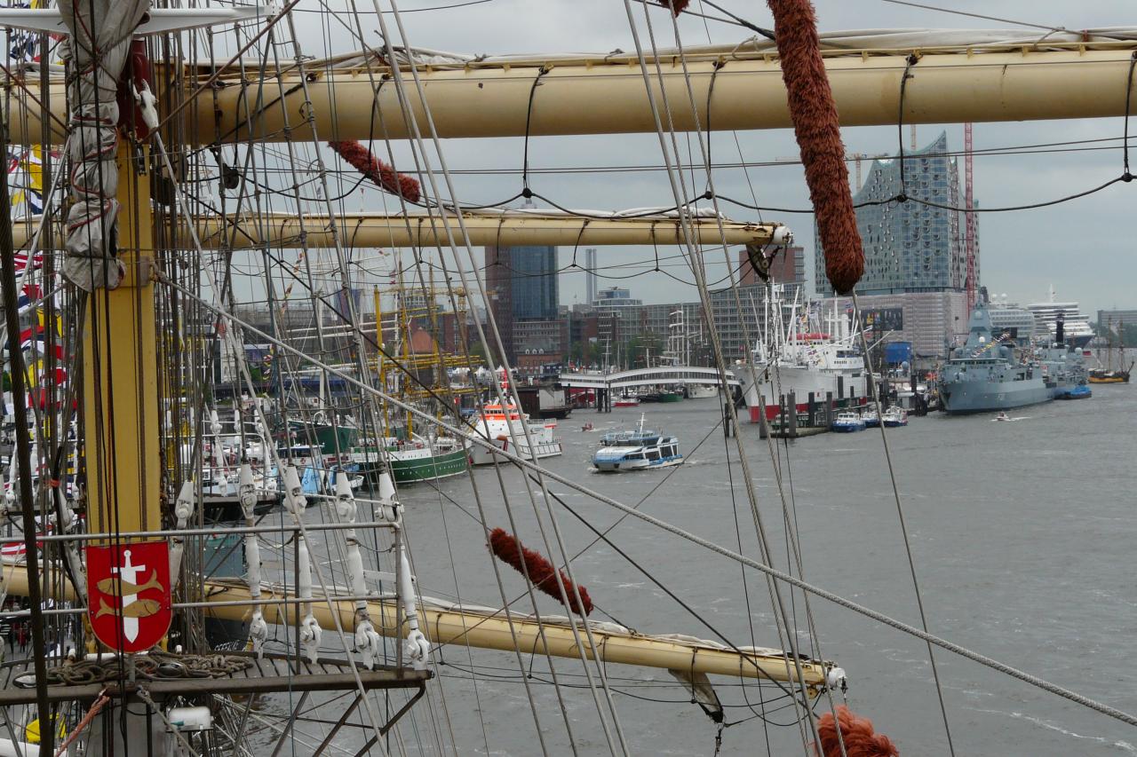 Relacjonuje komendant żaglowca, kpt.ż.w. Rafał Szymański: "W piątek braliśmy udział w paradzie wejściowej - płynęliśmy jako pierwszy żaglowiec, za fregatą Bundesmarine - FGS "Hamburg". Pogoda nie dopisała, w trakcie parady szkwał do 9 B!. Mimo ulewnego deszczu na Landungsbrucken czekały na nas tłumy. "Dar" jest jedynym pełnorejowcem w Hamburgu. Na okręcie FGS "Hamburg" odbyło się uroczyste powitanie z wręczeniem okolicznościowych ryngrafów. Dar udostępniono zwiedzającym - długie kolejki do trapu świadczyły o zainteresowaniu naszym żaglowcem. Telewizja NDR prowadziła bezpośrednią transmisję z pokładu, włącznie z wywiadem, którego udzielał dyrektor Portu Hamburg. Uczniowie brali udział w halowym turnieju piłkarskim - nasze drużyny zajęły 2 i 3 miejsca, a w zawodach strzeleckich - drugie miejsce. Kulminacyjnym punktem obchodów był wspaniały pokaz sztucznych ogni."