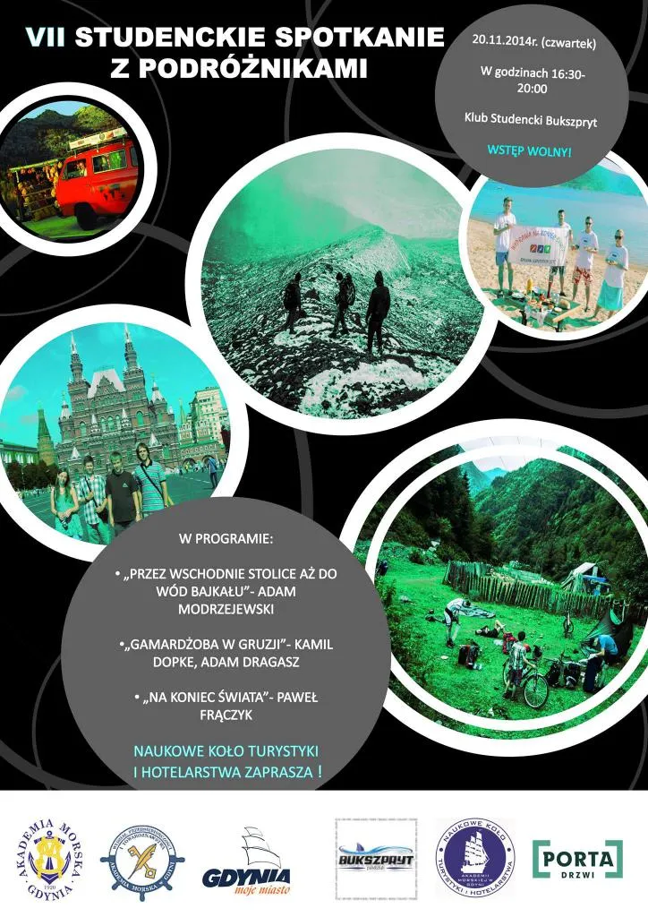 20 listopada 2014 r. w godz. 16:30 - 20:00 w Klubie Studenckim Bukszpryt (na terenie Akademii Morskiej w Gdyni) odbędzie się VII Studenckie Spotkanie z Podróżnikami. Spotkanie dedykowane jest dla wszystkich pasjonatów podróży.