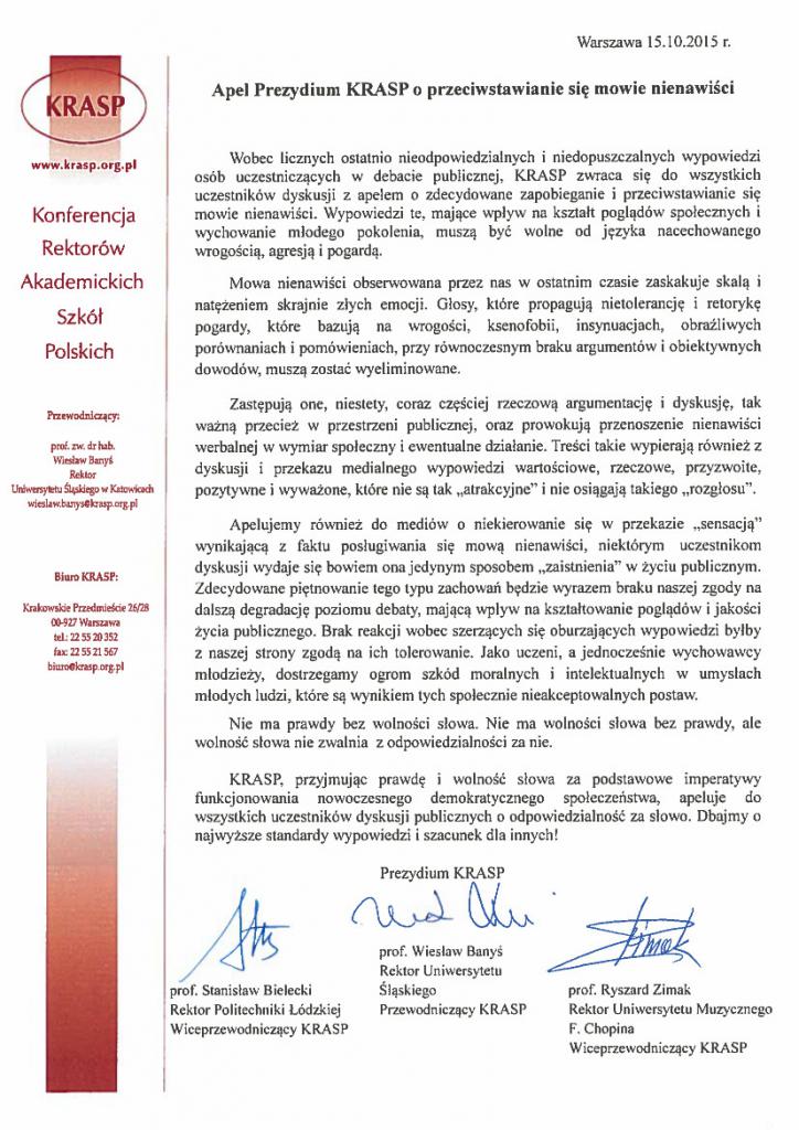 Prezydium Konferencji Rektorów Akademickich Szkół Polskich (KRASP) wystosowało apel o przeciwstawienie się mowie nienawiści w aktualnie toczącej się debacie publicznej i politycznej. „Nie ma wolności słowa bez prawdy, ale wolność słowa nie zwalnia z odpowiedzialności za nie” - głosi apel.