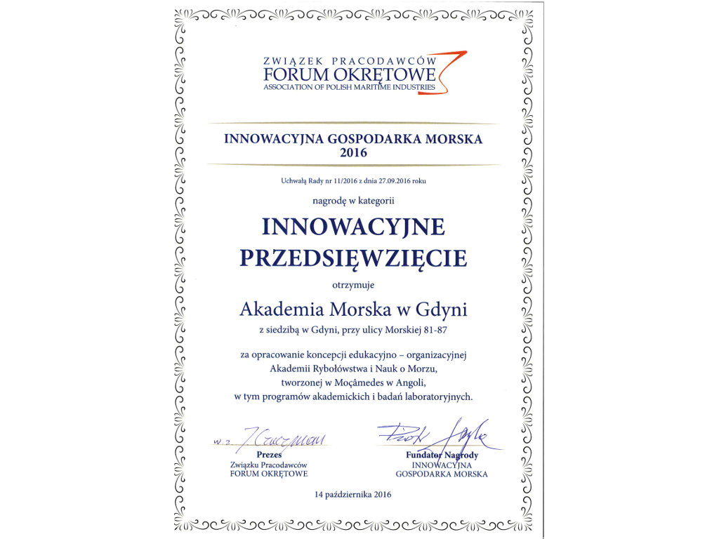 Akademia Morska w Gdynia otrzymała nagrodę w kategorii Innowacyjne Przedsięwzięcie za opracowanie koncepcji edukacyjno - organizacyjnej Akademii Rybołówstwa i Nauk o Morzu, tworzonej w Angoli, w tym programów akademickich i badań laboratoryjnych.