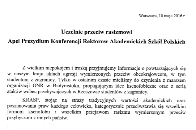 Z wielkim niepokojem i troską przyjmujemy informacje o powtarzających się w naszym kraju aktach agresji wymierzonych przeciw obcokrajowcom, w tym studentom z zagranicy. Tylko w ostatnim czasie mieliśmy do czynienia z marszem organizacji ONR w Białymstoku, propagującym idee ksenofobiczne oraz z serią ataków wobec przebywających w Rzeszowie studentów z zagranicy.