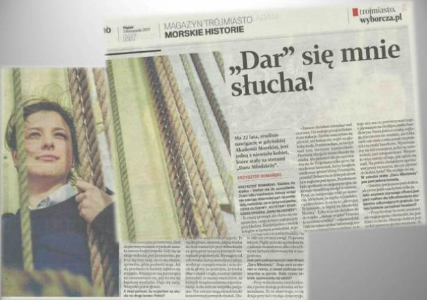 - .... Do Gdyni przyjechałam na studia. Po ukończeniu pierwszego roku zaczęliśmy praktyki morskie na „Darze”. Nigdy wcześniej nie miałam do czynienia z żaglowcami. Bardzo mi się spodobało. Na tyle, że stwierdziłam, że chcę zostać. Akurat była możliwość, by po zakończonych praktykach pożeglować na statku jeszcze tydzień. Zostałam. Po drugim roku byłam już młodszym instruktorem. To ktoś, kto organizuje pracę całej wachty. Rozdziela tzw. dobówki – mówi, kto zajmie się kuchnią, kto żaglami, a kto toaletami. Jest też łącznikiem między wachtą, bosmanem i oficerami. Sprawdziłam się. Nie miałam problemów z pracą ani z wchodzeniem na maszty, dlatego później poparto moją kandydaturę, by kontynuować pływanie w roli młodszego instruktora, a w tym sezonie jestem już członkiem załogi stałej „Daru Młodzieży”.......