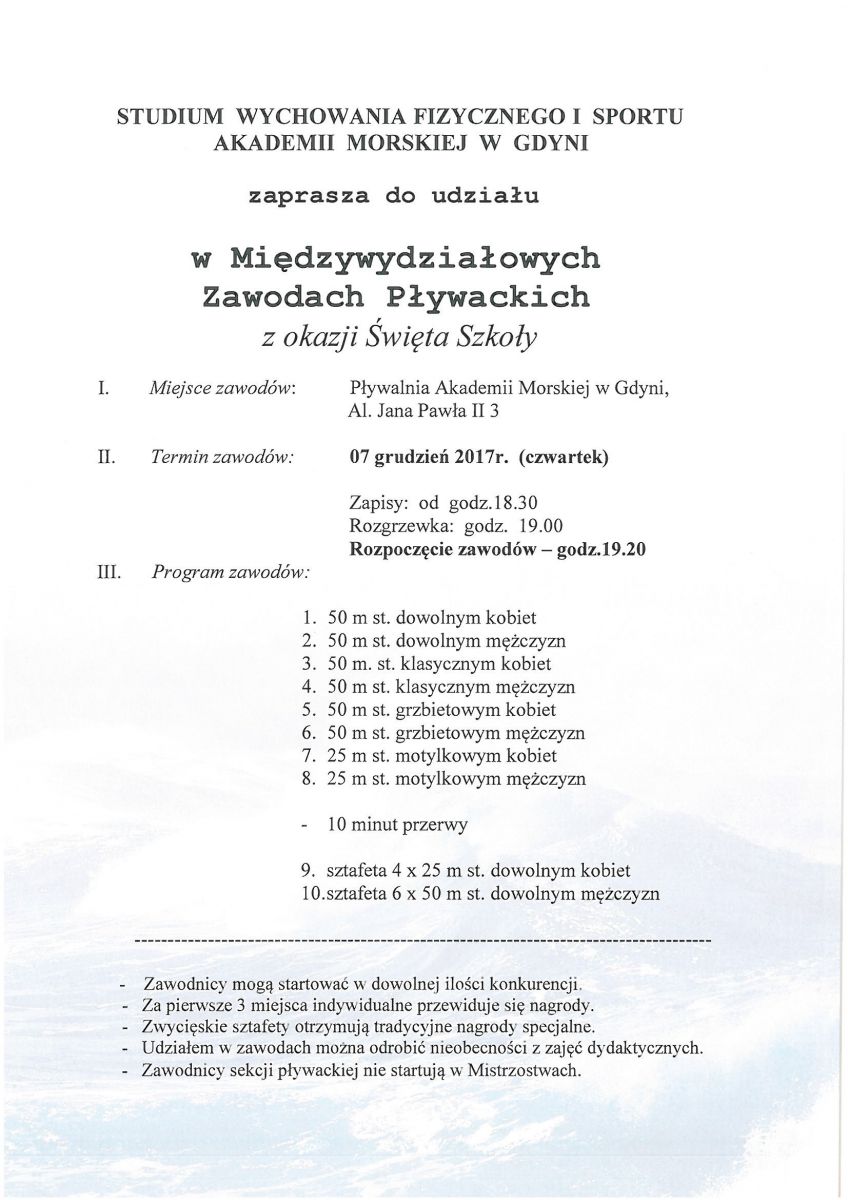 W dniu 7 grudnia 2017 roku o godzinie 19.20 na pływalni Akademii Morskiej w Gdyni odbędą się Międzywydziałowe Zawody Pływackie. Konkurencje indywidualne stylami dowolnym, klasycznym i grzbietowym odbędą się na dystansie 50-cio metrowym zaś motylkowym 25-cio metrowym. W sztafetach zawodnicy płyną dystans 4x25 metrów stylem dowolnym (kobiety) i 6x50 metrów stylem dowolnym (mężczyzni). To właśnie sztafety punktują do ogólnej klasyfikacji międzywydziałowej.