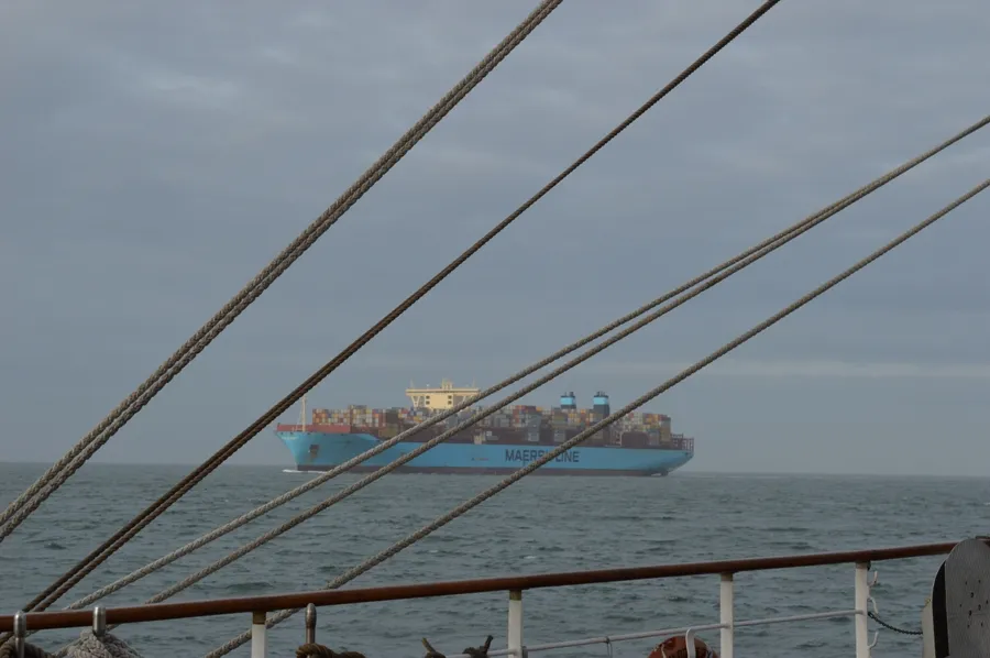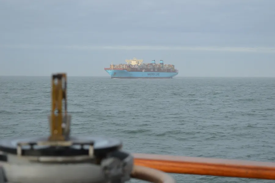 W rejonie Skagen (północny cypel Jutlandii), portu na którego redzie "Dar Młodzieży" uzupełniał paliwo, doszło do spotkania z oceanicznym gigantem - jednym z wielkich statków klasy Triple E duńskiego armatora Maersk Line - światowego potentata na rynku operatorów kontenerowych.