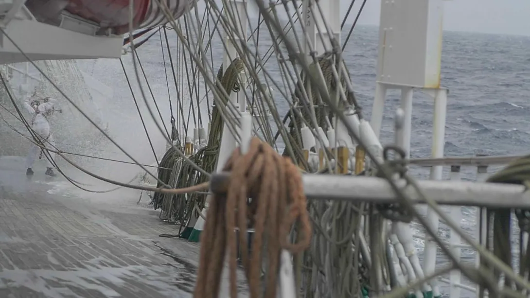 Po praktykantach widać zmęczenie złą pogodą, ale większość jest w dobrej formie. Szkolenie młodych nawigatorów toczy się normalnym trybem – „czy w sztormie czy w ciszy”. Jak tylko pogoda pozwoli prace konserwacyjne ruszą pełną parą. "Dar" musi się pięknie zaprezentować w Osace.