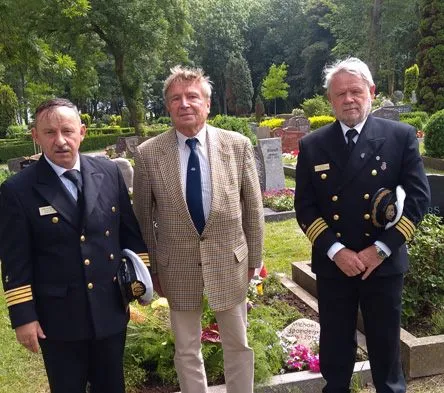 Komendant Lewandowski ze starszym oficerem Wiesławem Suchockim w towarzystwie profesora Hansa Rummla odwiedzili grób kpt.ż.w. Tadeusza Olechnowicza, ostatniego komendanta "Daru Pomorza" i pierwszego "Daru Młodzieży", który ostatni okres życia spędził właśnie w Bremerhaven.