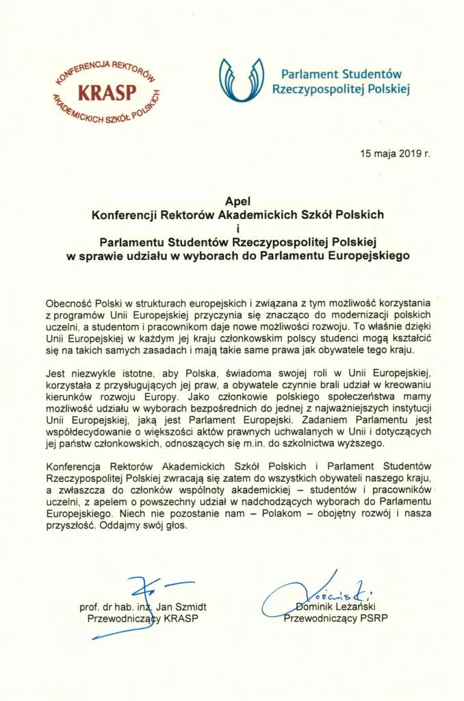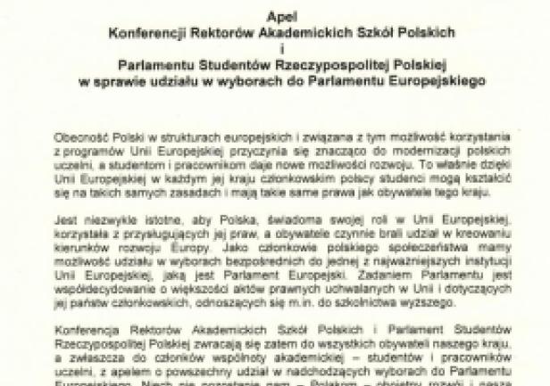 Konferencja Rektorów Akademickich Szkół Polskich i Parlament Studentów Rzeczypospolitej Polskiej zwracają się zatem do wszystkich obywateli naszego kraju, a zwłaszcza do członków wspólnoty akademickiej – studentów i pracowników uczelni, z apelem o powszechny udział w nadchodzących wyborach do Parlamentu Europejskiego. Niech nie pozostanie nam – Polakom – obojętny rozwój i nasza przyszłość. Oddajmy swój głos.