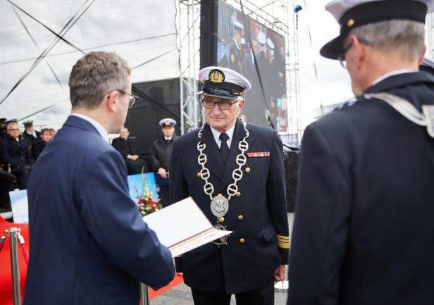 Oficjalna część uroczystości na Molo Południowym rozpoczęła się złożeniem meldunku Panu Grzegorzowi Witkowskiemu – Podsekretarzowi Stanu w Ministerstwie Gospodarki Morskiej i Żeglugi Śródlądowej oraz Jego Magnificencji Rektorowi prof. dr. hab. inż. Januszowi Zarębskiemu przez Dowódcę Uroczystości. Następnie, na znak włączenia Instytutu Morskiego w Gdańsku w strukturę Uniwersytetu Morskiego w Gdyni,  Jego Magnificencja Rektor prof. dr hab. inż. Janusz Zarębski przekazał Dyrektorowi Instytutu Morskiego Panu prof. Maciejowi Matczakowi insygnium symbolizujące godność urzędu oraz przynależność do społeczności Uniwersytetu Morskiego w Gdyni. Z tej okazji podpisany został uroczysty akt nadania insygnium.