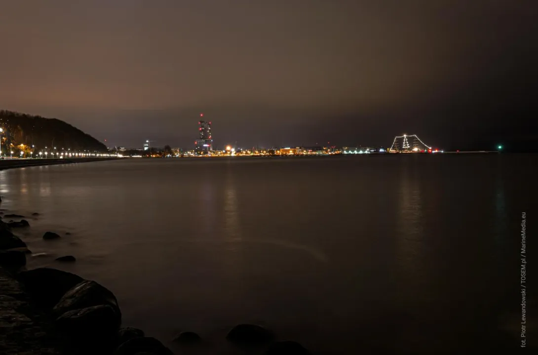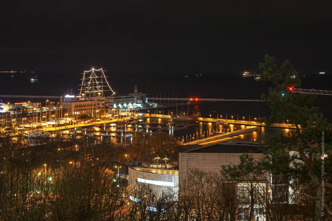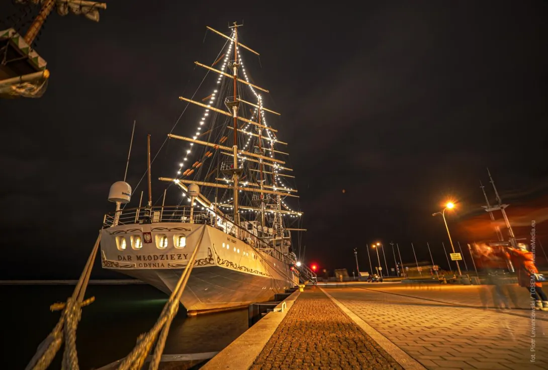 Na masztach Daru Młodzieży (Nabrzeże Pomorskie w Gdyni) rozbłysła niezwykła choinka ze światełek.