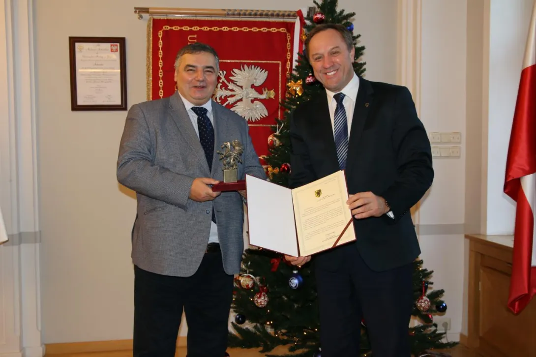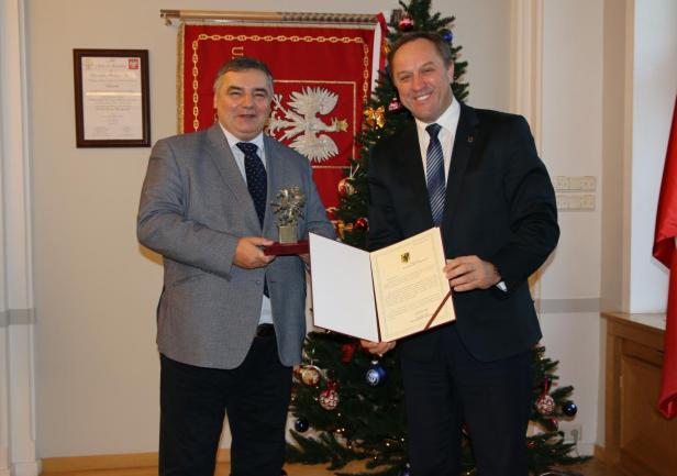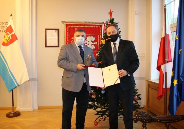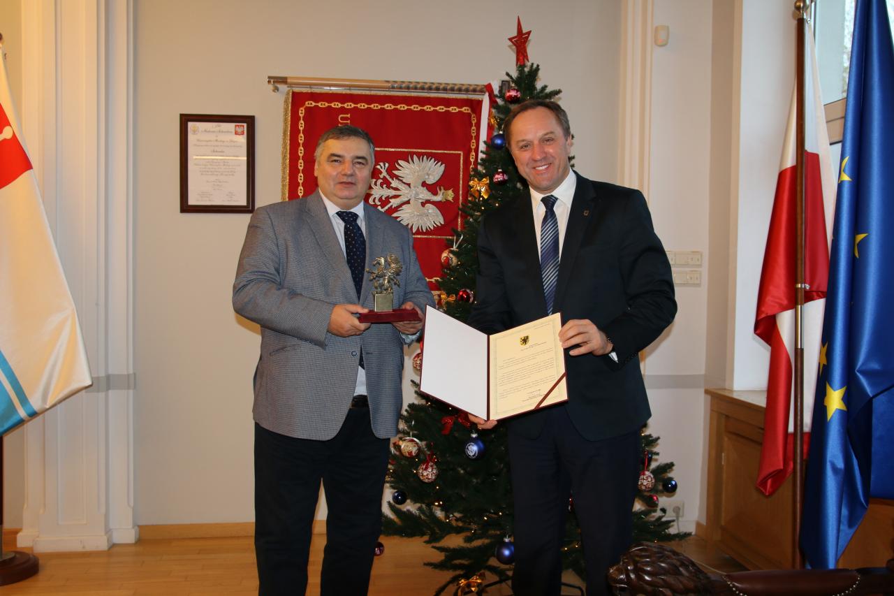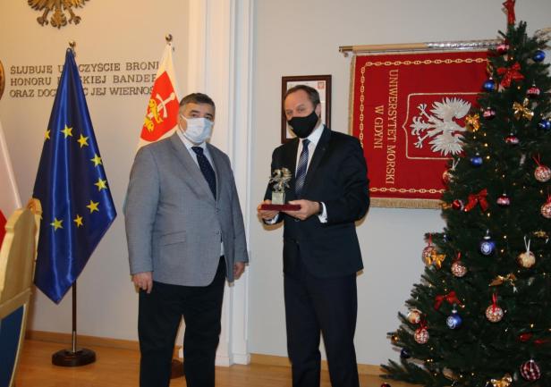 Pan Marszałek Mieczysław Struk wręczył Panu Rektorowi list okolicznościowy oraz statuetkę Gryfa Pomorskiego wraz z życzeniami dla całej społeczności akademickiej Uniwersytetu Morskiego w Gdyni.