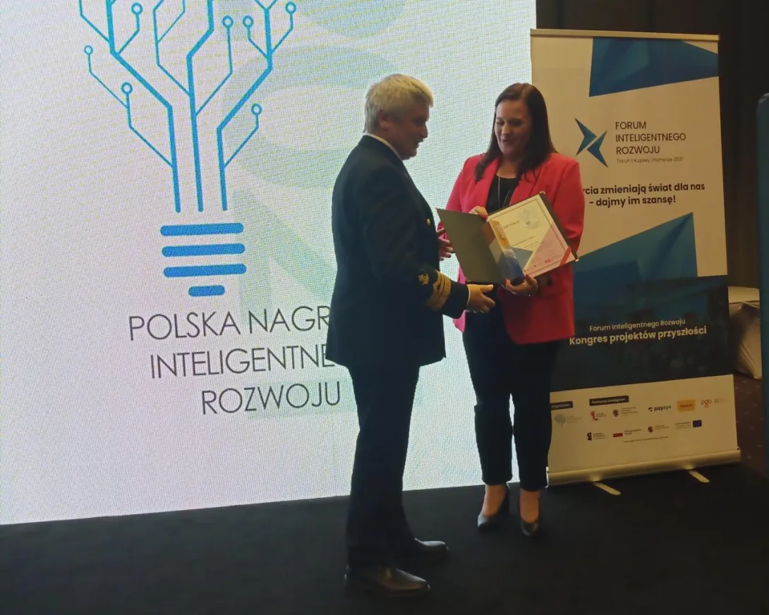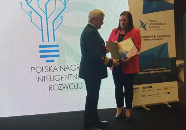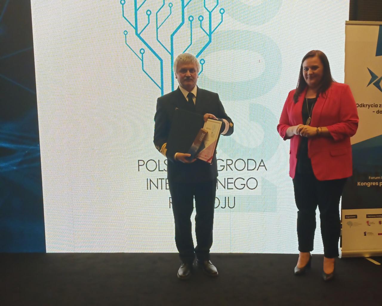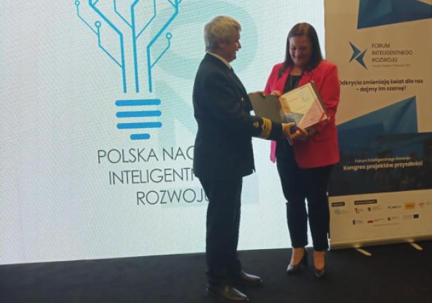 Prorektor ds. Współpracy i Rozwoju Uniwersytetu Morskiego w Gdyni prof. Tomasz Tarasiuk w imieniu Uczelni odebrał z rąk Wiceminister Funduszy i Polityki Regionalnej Pani Małgorzaty Jarosińskiej-Jedynak Polską Nagrodę Inteligentnego Rozwoju.