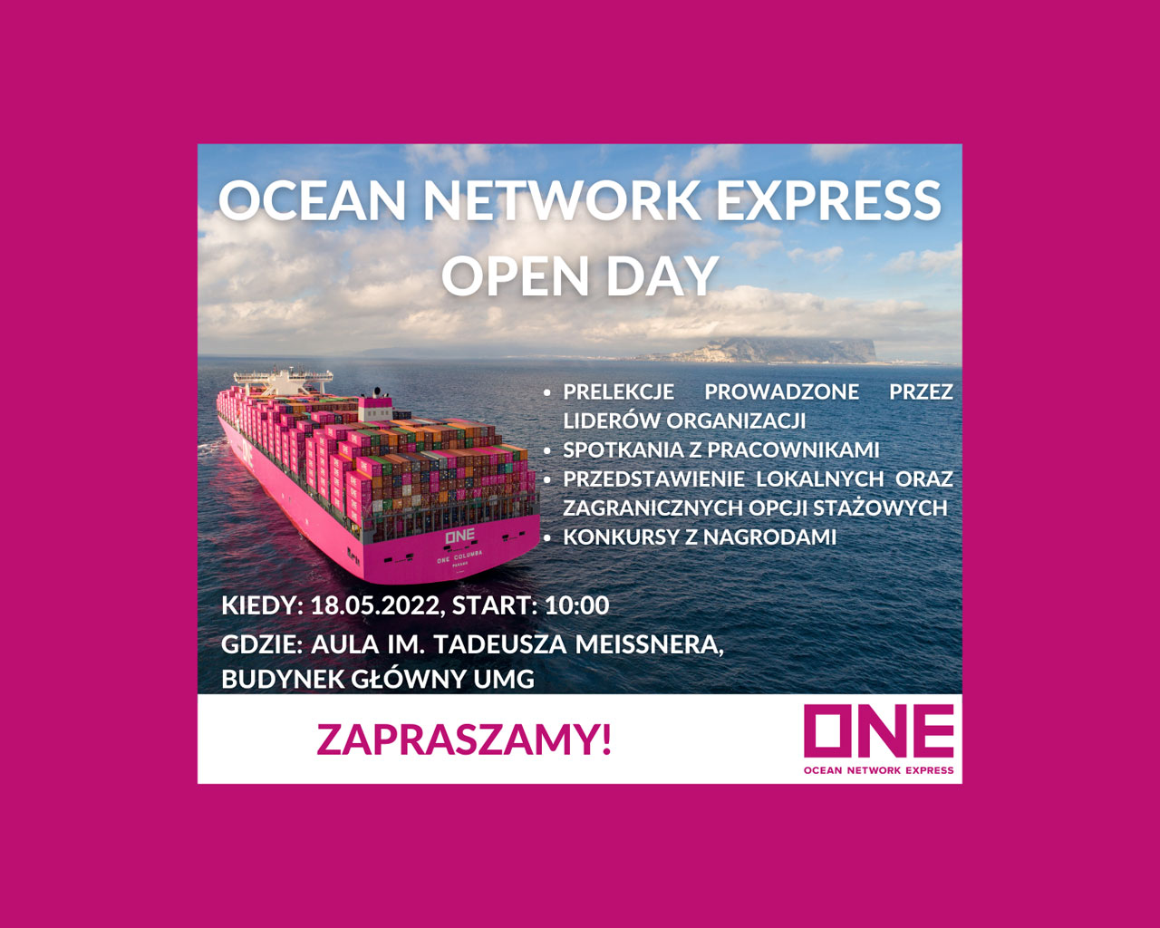 Firma Ocean Network Express, światowy lider branży transportu morskiego zaprasza na Open Day, który odbędzie się 18.05.2022 o 10:00 na auli im. T. Meissnera w budynku głównym UMG.