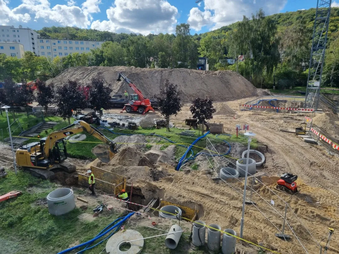 Kolejne wykonane prace to roboty ziemne i rozbiórkowe, w tym usunięcie starej drogi oraz ogrodzenia wewnętrznego. Na najbliższy czas zaplanowana jest budowa sieci kanalizacji sanitarnej i deszczowej. Na dzień dzisiejszy wykonano podłoże pod płytę fundamentową, trwają prace zbrojarskie oraz roboty sanitarne.