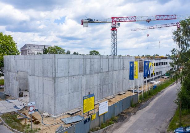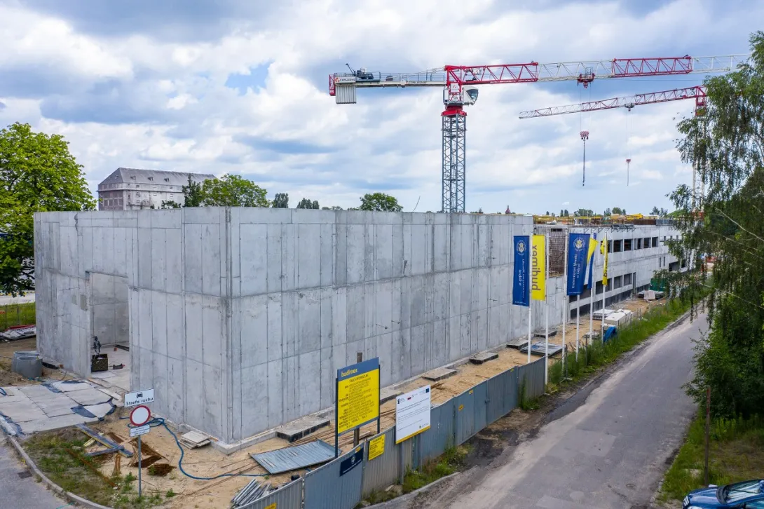 W łączniku wykonano wzmocnienie podłoża gruntowego, postawiono fundamenty oraz słupy i ściany kondygnacji 0. Aktualnie trwają prace związane z realizacją belek żelbetowych, na których zostaną ułożone stropy prefabrykowane.