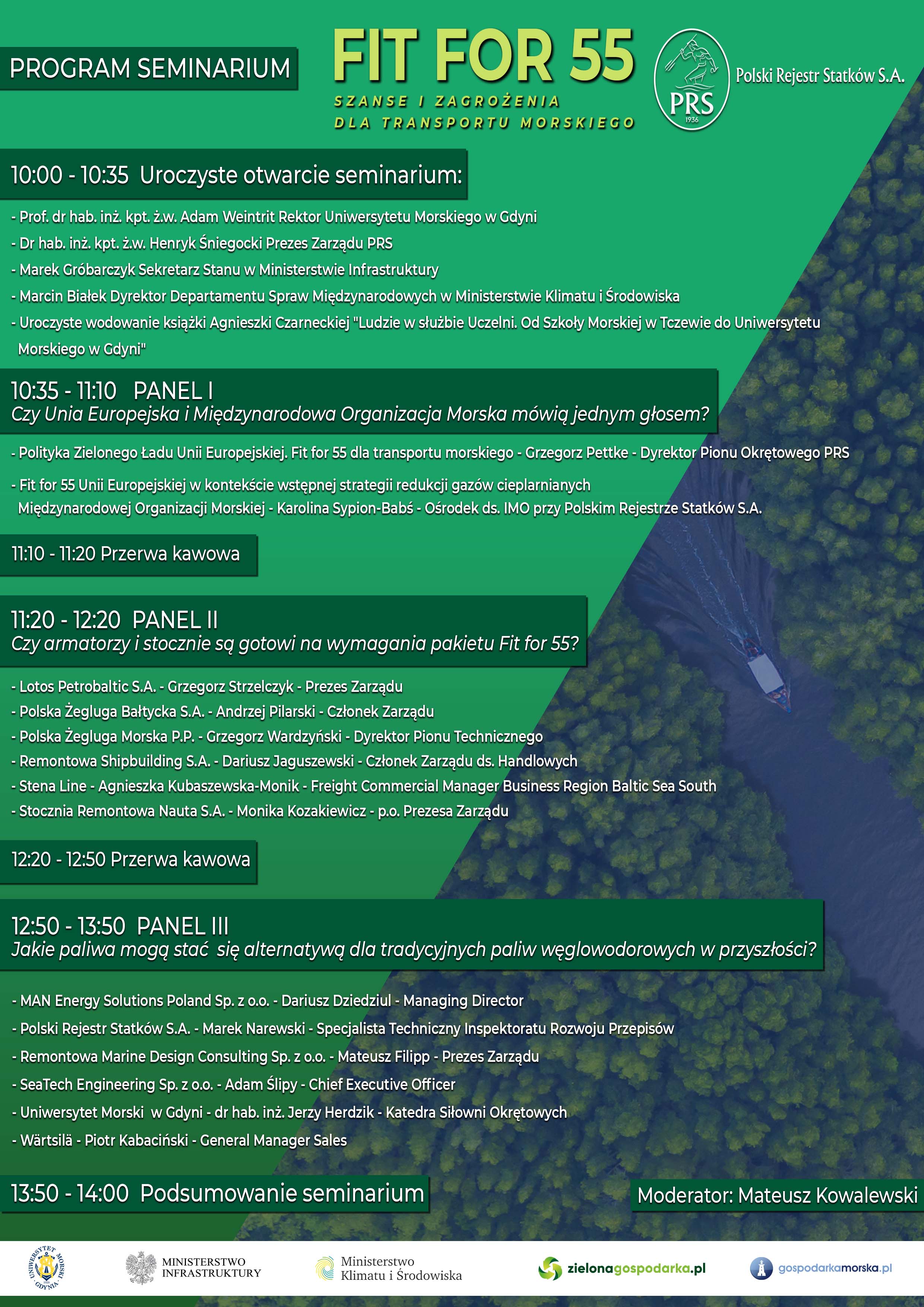 Seminarium dotyczyło polityki Zielonego Ładu Unii Europejskiej i jej wpływu na gospodarkę morską. „Fit for 55” to pakiet projektów legislacyjnych, którym przyświeca zadanie podwyższenia celów klimatycznych Unii Europejskiej i jej krajów członkowskich. Celem planowanych zmian jest ograniczenie emisji gazów cieplarnianych do atmosfery o 55% do 2030 r., w porównaniu z poziomem z roku 1990. Unii Europejskiej zmierza do tego, by stać się pierwszym neutralnym klimatycznie kontynentem w 2050 r.