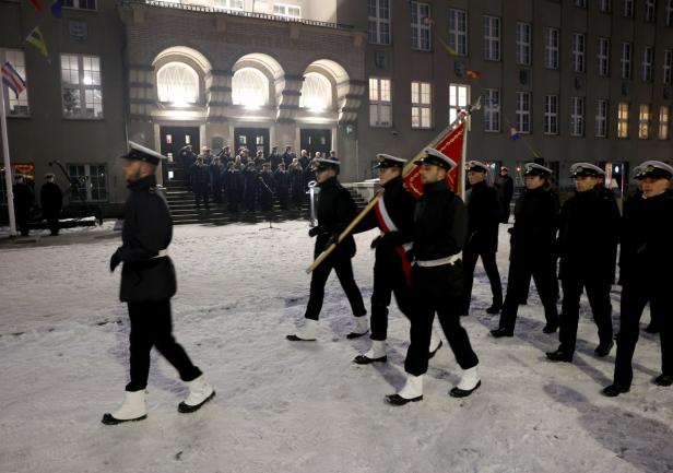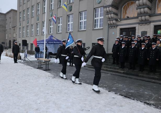 Uroczystość rozpoczęła się punktualnie o godzinie 8:00 rano tradycyjnym, uroczystym podniesieniem bandery. Ta najstarsza tradycja w Uczelni została zapoczątkowana 103. lata temu w Tczewie, kiedy to młodzi ludzie, dla zainaugurowania działalności Szkoły Morskiej, podnieśli na budynku polską banderę, ponieważ Szkoła nie dysponowała jeszcze żadnym statkiem.