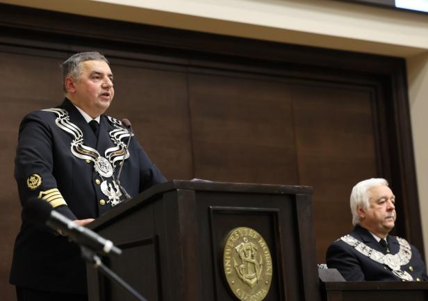 JM Rektor podsumował sukcesy pracowników Uczelni i wydarzenia mijającego roku, w tym niemal już ukończone inwestycje – Centrum Offshore UMG oraz Centrum Sportu i Rekreacji. Z dumą przedstawił uhonorowanego tytułem doktora honoris causa UMG profesora Hansa Rummla z Hochschule Bremerhaven oraz zapowiedział wręczenie kolejnego dyplomu prof. Bradfordowi Parkinsonowi ze Stanford University, nazywanemu „ojcem Globalnego Systemu Nawigacyjnego GPS”. JM Rektor złożył gratulacje naukowcom, którzy w tym roku otrzymali nominacje profesorskie – profesorowi Krzysztofowi Czaplewskiemu oraz profesorowi Ireneuszowi Czarnowskiemu.