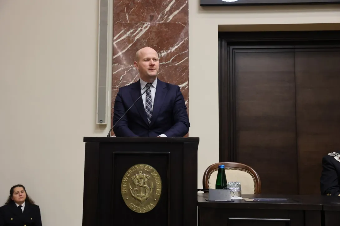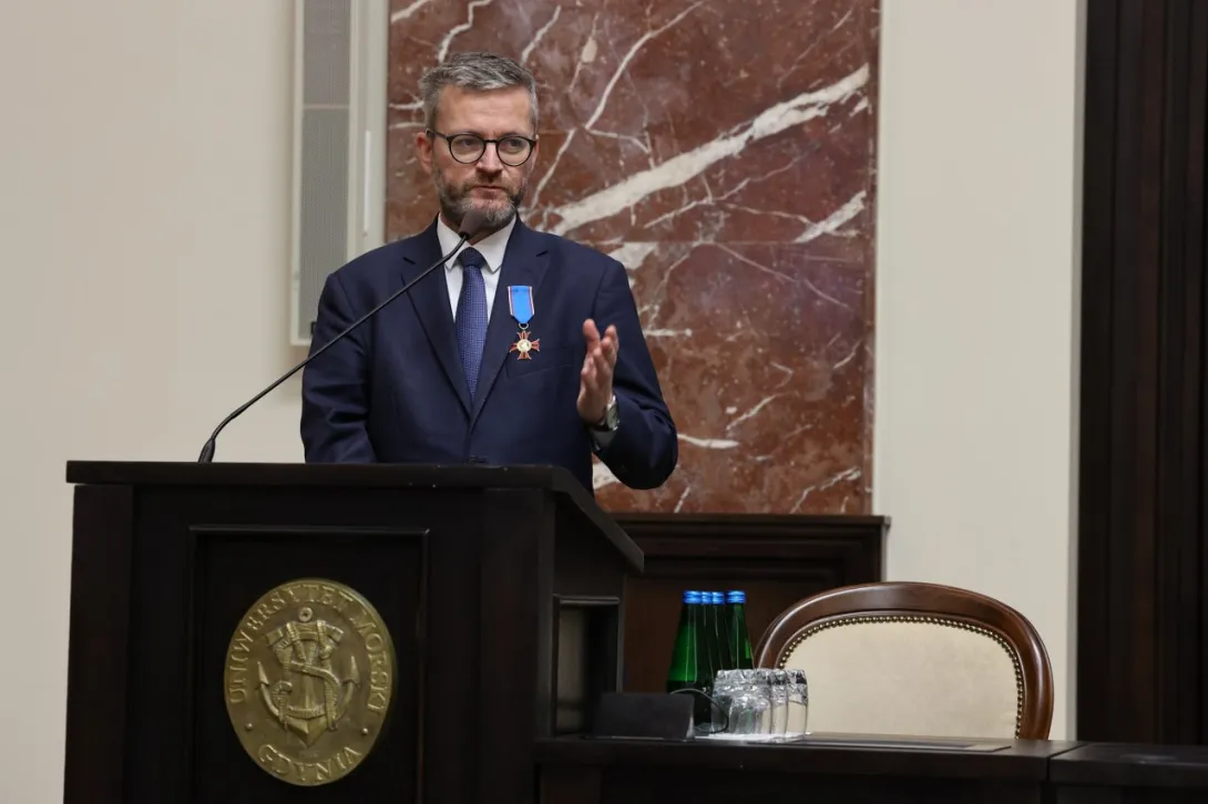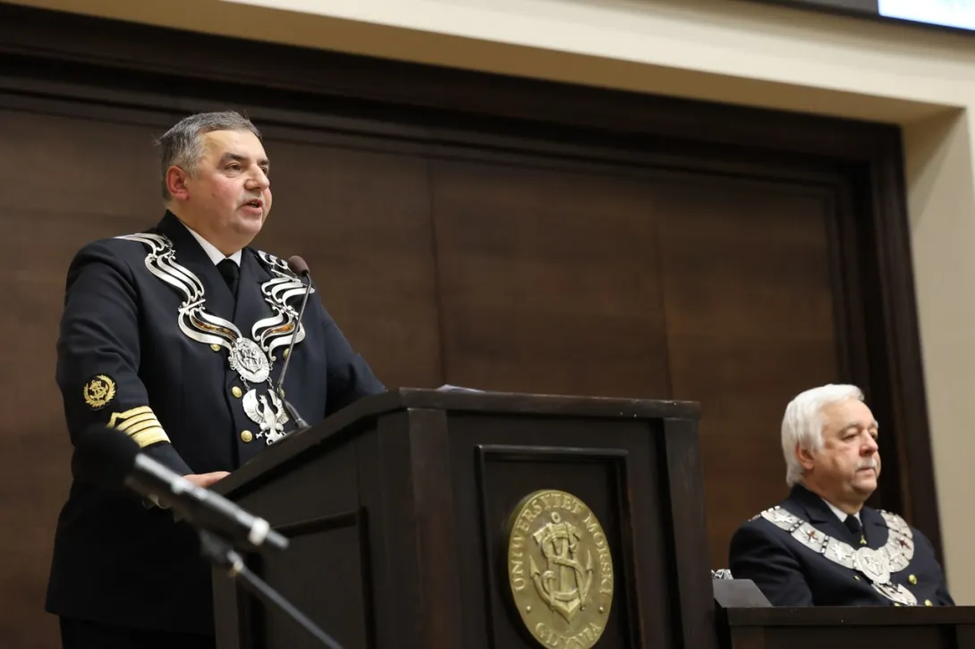 Uniwersytet Morski w Gdyni to – oprócz tradycji, o której pięknie mówił Jego Magnificencja Rektor – również ludzie, historia, dorobek i przyszłość. Ta przyszłość rysuje się przed Państwem bardzo pięknie i bardzo szeroko. To, co najważniejsze, jest przed Państwem. Tym, co dzięki rządowym funduszom udało się już dokonać, są inwestycje, o których mówił JM Rektor, a przede wszystkim Centrum Offshore UMG. Jest to bardzo duże przedsięwzięcie i bardzo duży skok cywilizacyjny. Inwestycja, która będzie kształcić kadry, ponieważ polskie porty po raz kolejny zanotują w tym roku gigantyczne rekordy ponad 130 milionów ton przeładowanych towarów. Na tej sali nie muszę nikogo przekonywać, że to jest wynik absolwentów między innymi Uniwersytetu Morskiego. Prosimy o więcej, ponieważ są to realne pieniądze do budżetu państwa, ale też jest to ogromne doświadczenie, które zdobywa biznes, zdobywa rynek i jest to również coś, czym możemy się pochwalić na świecie. Centrum Offshore UMG, które będzie kształciło kadry na rzecz energetyki wiatrowej na morzu jest tym, czego państwo polskie, biznes i rynek potrzebują.