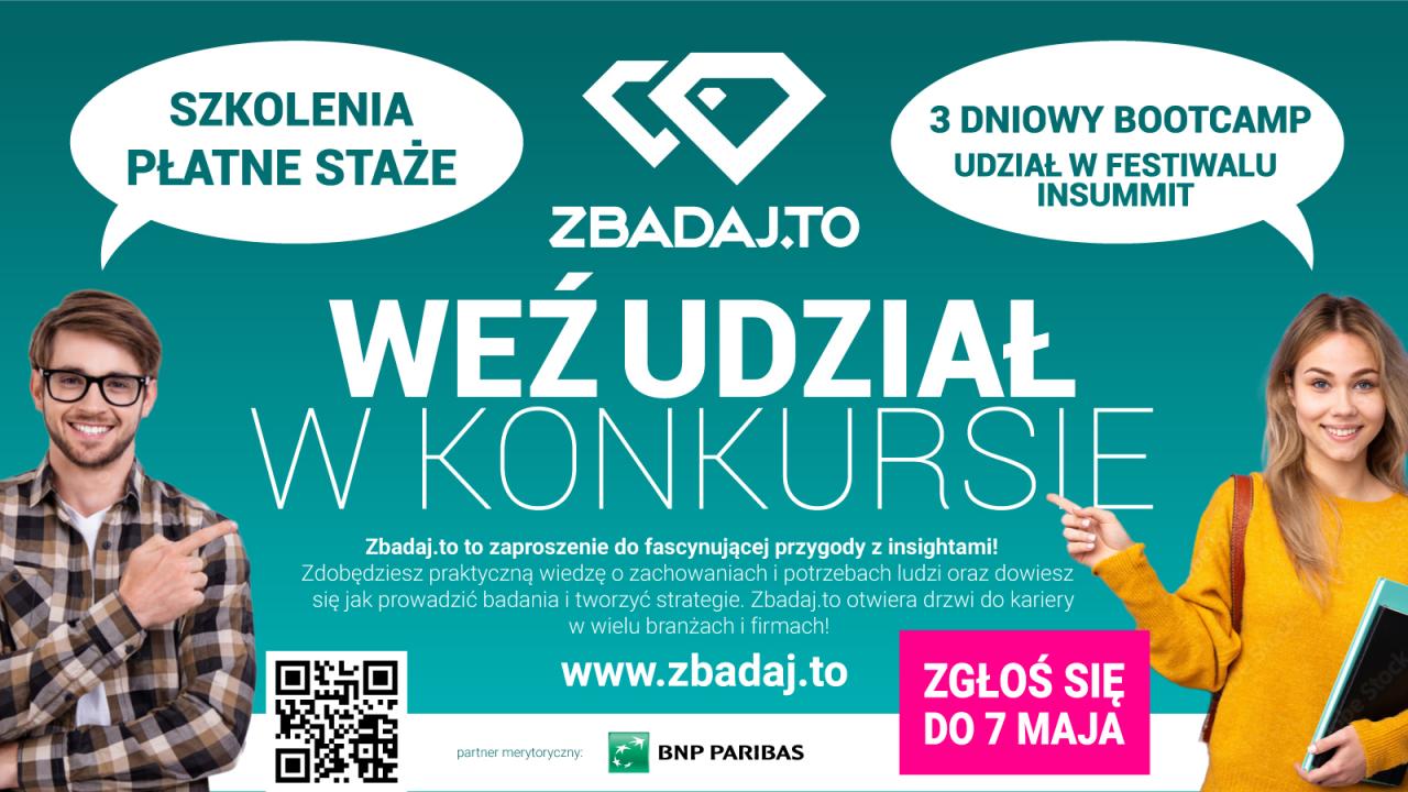 Zbadaj.to toZbadaj.to to zaproszenie do fascynującej przygody z insightami! Dzięki udziałowi w konkursie zdobędziesz praktyczną wiedzę o zachowaniach i potrzebach ludzi oraz dowiesz się jak prowadzić badania i tworzyć strategie. To bardzo poszukiwane kompetencje, niezbędne w wielu zawodach i branżach. Finałowy Boot Camp zbadaj.to z udziałem doświadczonych praktyków biznesu to prawdziwy booster Twojej kariery i networkingu! W 2023 partnerem konkursu jest Bank BNP Paribas…