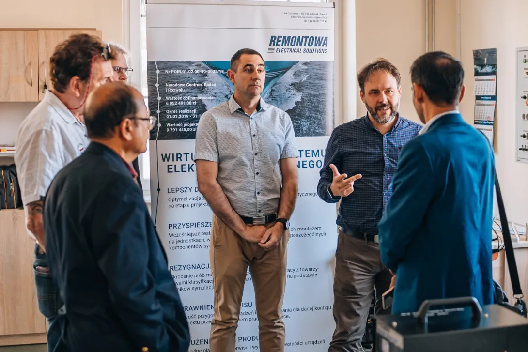 W ramach spotkania zaprezentowano laboratoryjne stanowisko z wirtualnym modelem systemu elektroenergetycznego statku zbudowane z wykorzystaniem technologii Hardware in the loop (HIL) w środowisku Typhoon Hil. Stanowisko zostało wykonane przez pracowników UMG, w kooperacji ze stocznią Remontowa Electrical Solutions w ramach projektu NCBiR nr POIR 01.02.00-00-005/1800 pt. „Zintegrowany system modelowania oraz graficznego projektowania instalacji elektrycznych na statkach”. Gościom przedstawiono wypracowane przez UMG (w kooperacji z RES) rozwiązanie i zademonstrowano pracę wirtualnego modelu okrętowego systemu elektroenergetycznego statku współpracującego z rzeczywistymi urządzeniami PMS (Power Management System) firmy Deif, powszechnie stosowanymi w technice okrętowej.
