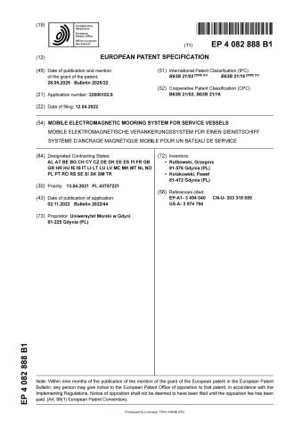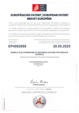 Europejski Urząd Patentowy EPO przyznał na rzecz Uniwersytetu Morskiego w Gdyni prawa wyłączne na wynalazek pt. "Mobile electromagnetic mooring system for surface vessels " i wydał dokument patentowy o nr 4082888. Twórcami opatentowanego wynalazku są dr hab. inż. kpt. ż.w. Grzegorz Rutkowski, prof. UMG oraz mgr inż. kpt. ż.w. Paweł Kołakowski z Katedry Nawigacji na Wydziale Nawigacyjnym.