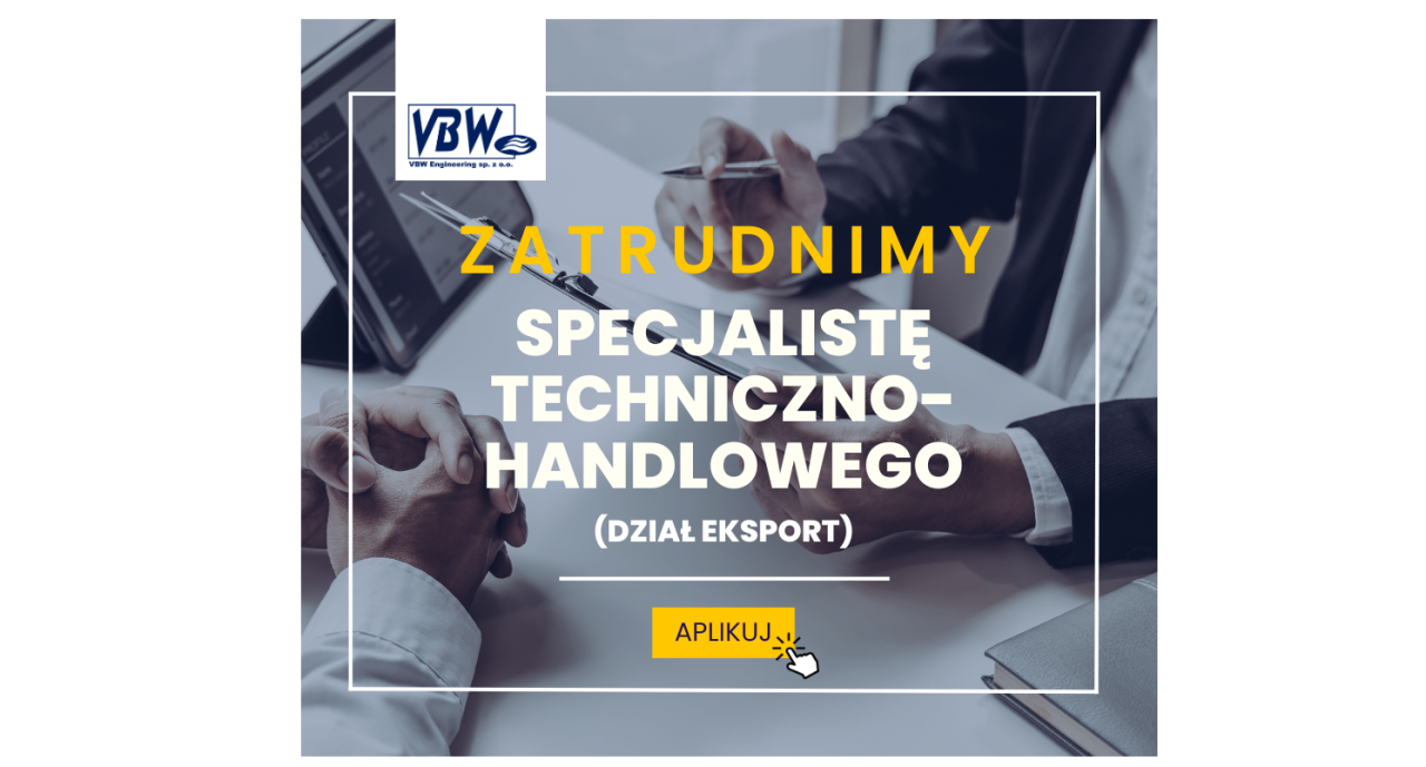 Osoby zainteresowane prosimy o przesłanie CV na podany niżej adres. W CV prosimy o zamieszczenie klauzuli o ochronie danych osobowych. Kontakt: email: rekrutacja@vbw.pl w temacie proszę podać: Specjalista ds. Techniczno-Handlowych
