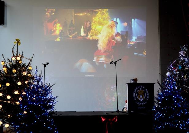 Uczestników spotkania w klimat świąt Bożego Narodzenia wprowadziły dwa krótkie filmy. Jeden z udziałem Kompanii Reprezentacyjnej Uczelni oraz św. Mikołaja, oraz drugi, w którym także wystąpił św. Mikołaj, życząc wszystkim pracownikom Uczelni radosnych i zdrowych świąt.