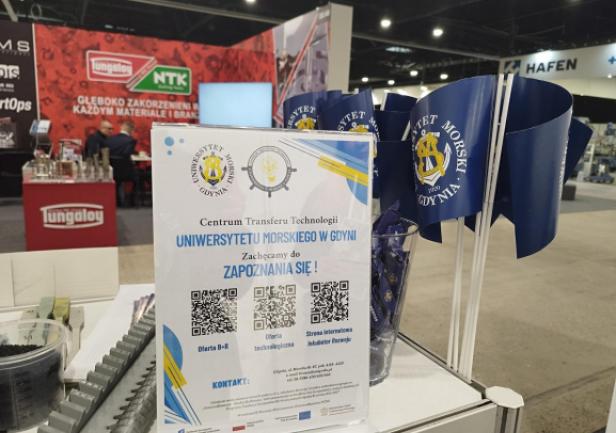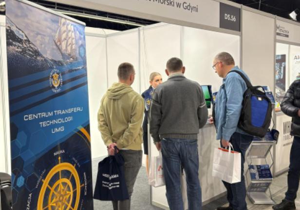 Ponadto osobom zainteresowanym przybliżane były pozostałe rozwiązania znajdujące się w uczelnianym portfelu technologicznym m.in. system dokowania do instalacji offshore, mobilny elektromagnetyczny system cumowniczy dla małych jednostek nawodnych, ośmiokanałowa nakładka rozszerzająca typu HAT czy pianka poliuretanowa modyfikowana nanochitozanem, a także katalog usług B+R i oferta kształcenia UMG.