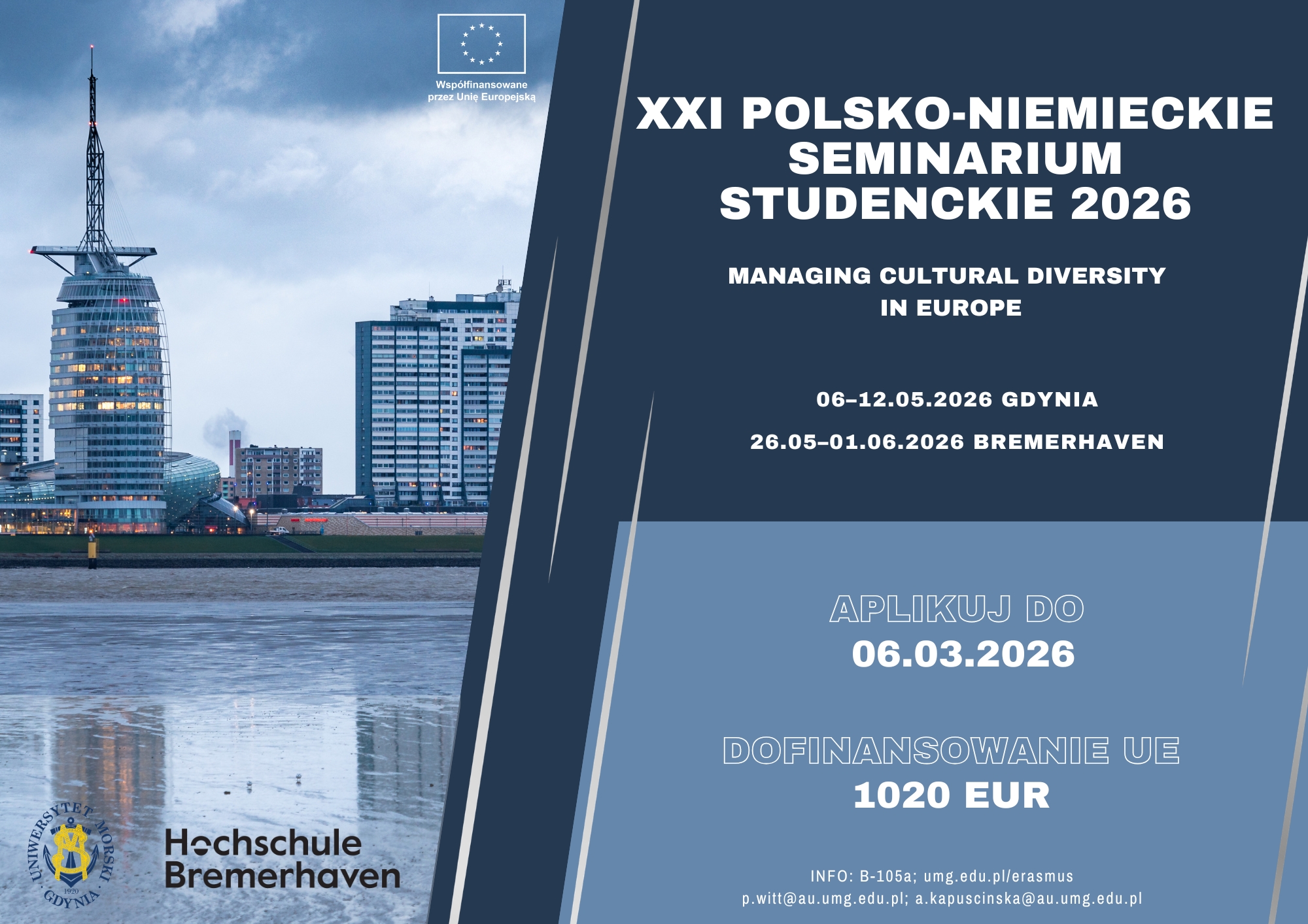 Seminarium trwa łącznie 2 tygodnie: w pierwszym tygodniu (06-12.05.2026) gościmy studentów z Hochschule Bremerhaven w Uniwersytecie Morskim w Gdyni, a następnie studenci UMG udają się do Hochschule Bremerhaven (26.05-01.06.2026), gdzie kontynuują zajęcia wspólnie ze studentami niemieckimi.