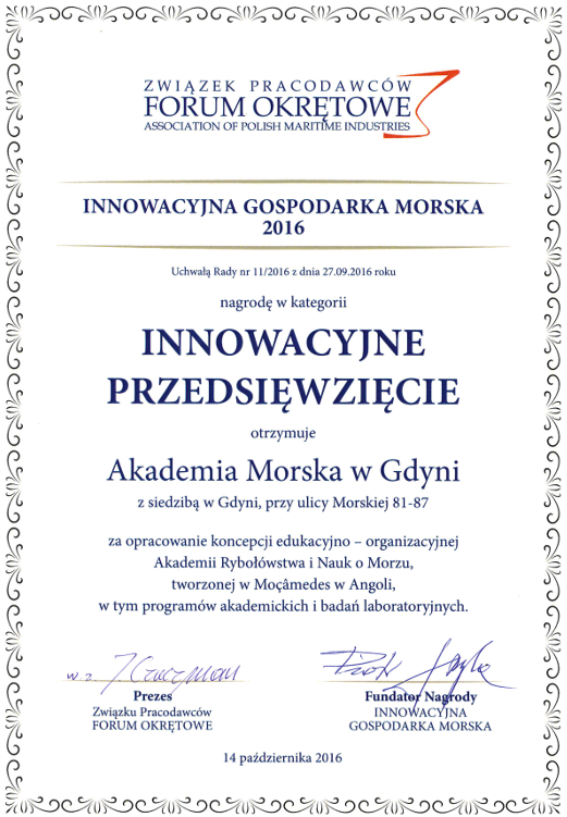 W 2016 roku Akademia Morska w Gdynia została uhonorowana nagrodą Związku Pracodawców Forum Okrętowego "Innowacyjna Gospodarka Morska 2016" w kategorii "Innowacyjne Przedsięwzięcie" za opracowanie koncepcji edukacyjno-organizacyjnej Akademii Rybołówstwa i Nauk o Morzu, tworzonej w Angoli, w tym programów akademickich i badań laboratoryjnych.