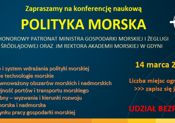 Akademia Morska w Gdyni, Wydział Przedsiębiorczości i Towaroznawstwa zaprasza na Ogólnopolską Konferencję Naukową POLITYKA MORSKA. Celem konferencji jest analiza stopnia realizacji polityki morskiej Polski i określenie metod, działań i narzędzi optymalnego wykorzystania morskiego potencjału Polski. Konferencja bezpłatna - liczba miejsc ograniczona.