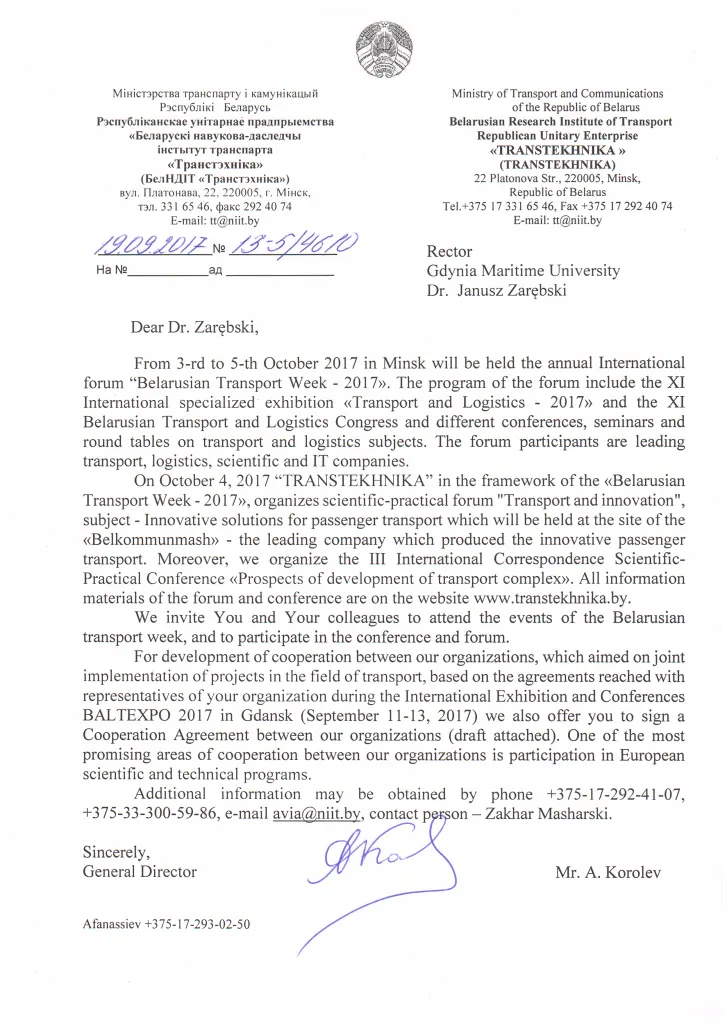 Serdecznie zapraszamy do udziału w forum międzynarodowym "Belarussian Transport Week - 2017", odbywającym się w dniach 3 - 5.10.2017 w Mińsku, na Białorusi.