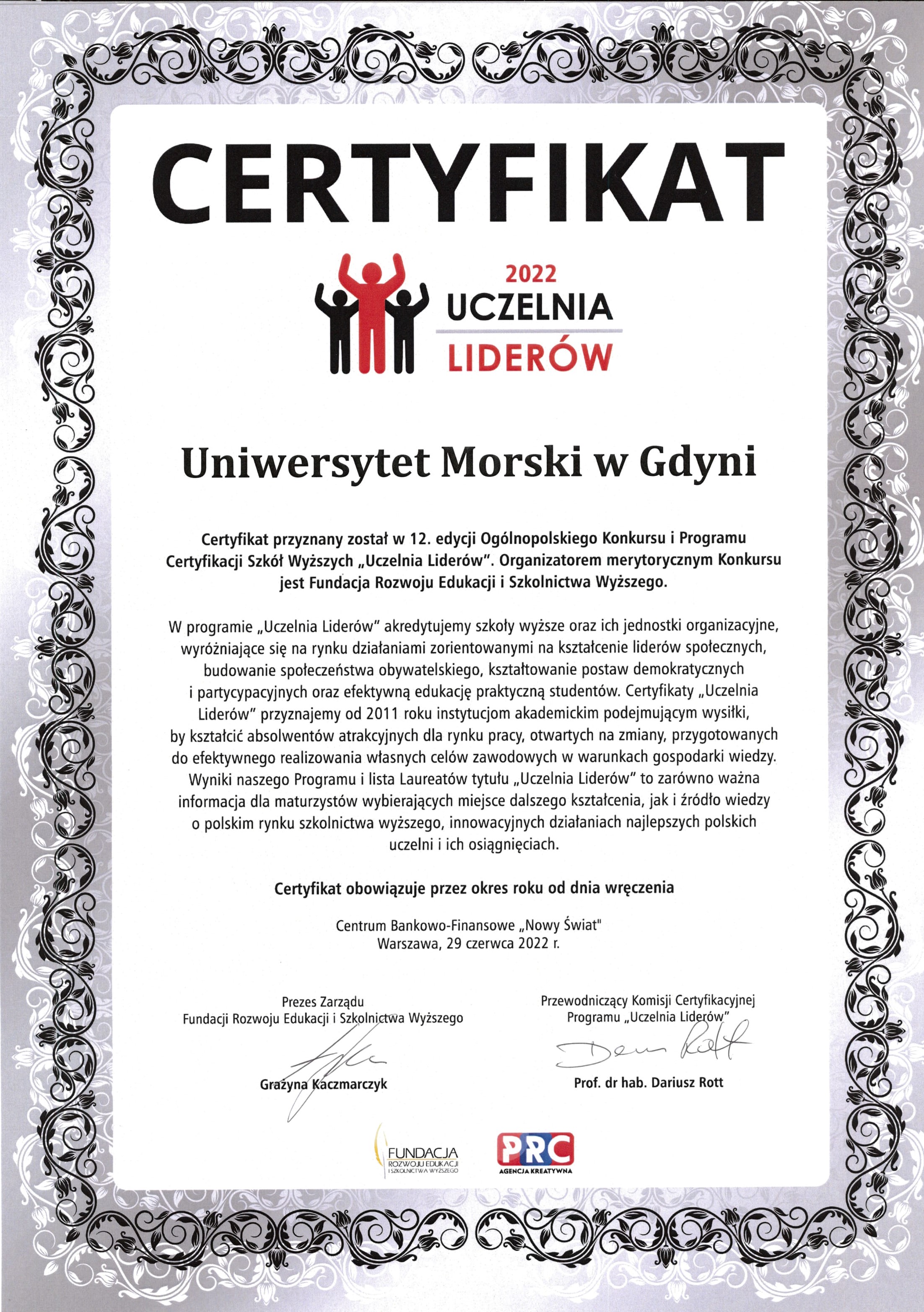 Uniwersytet Morski w Gdyni, decyzją Komisji Certyfikacyjnej Programu „Uczelnia liderów”, został laureatem 12. edycji Konkursu, uzyskując certyfikat "Uczelnia Liderów 2022".